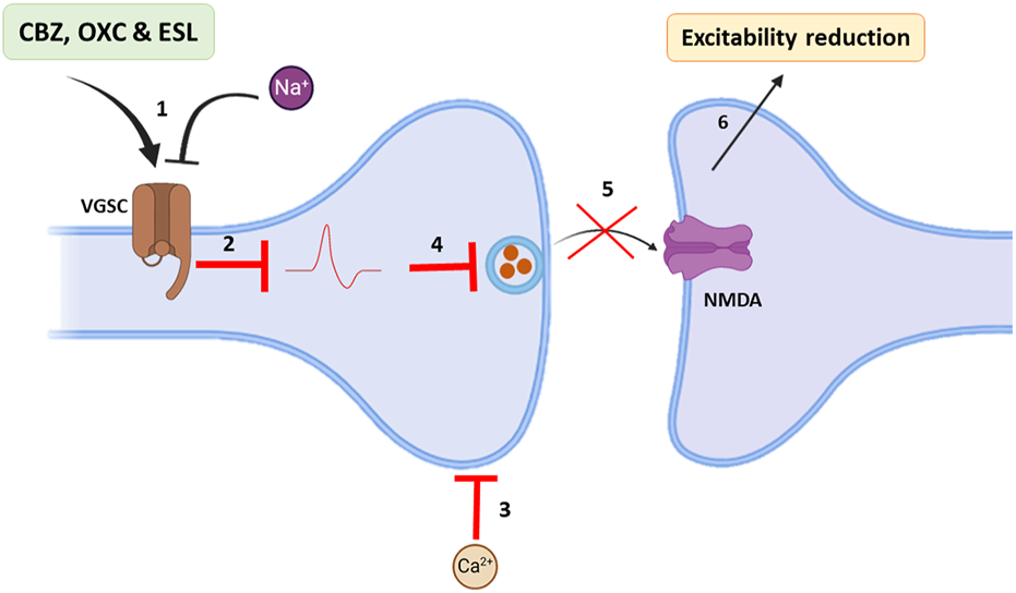 Figure 2. Main antiepileptic actions of dibenzazepines. 1: VGSCs of brain neurons become impermeable to sodium in the presence of dibenzazepines; 2: Hence, action potentials are blocked. 3: In addition, calcium entrance from synaptic space decreases. 4 and 5: Therefore, glutamate release and its effects on NMDA receptors are declined. 6: All these events reduce brain excitability. Voltage-gated Na+ channels: VGSCs, N-methyl-D-aspartate: NMDA. By Biorender.com.