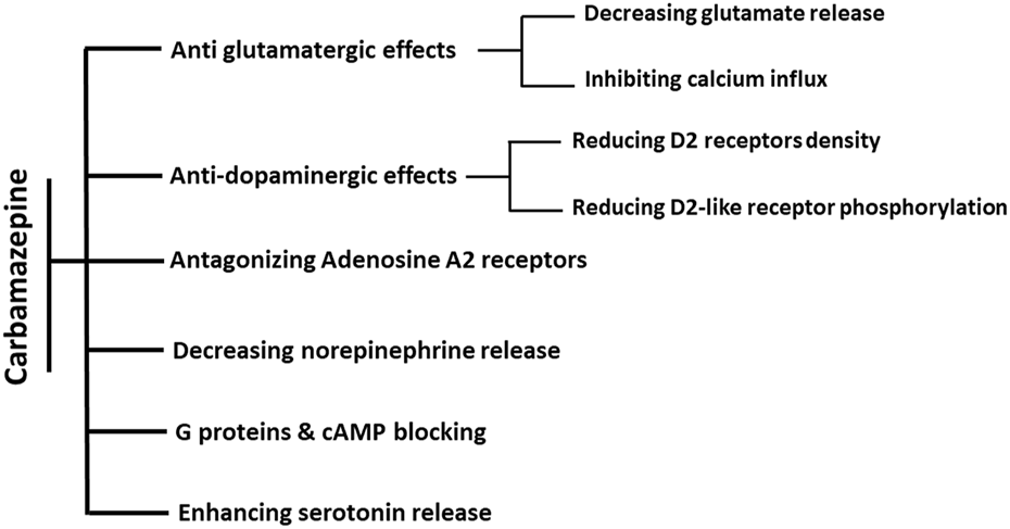 Summary of known actions of dibenzazepines in Mood stabilization. The effects of CBZ on mood regulation are through six mechanisms. Antiglutamatergic effects are through reducing glutamate release and calcium influx inhibition. The decrease in dopamine efficacy is induced by the decline in both the density and phosphorylation of D2 receptors. Moreover, these effects are shown by increasing the release of serotonin, decreasing the release of norepinephrine, antagonistic effects of adenosine on A2 receptors, and blocking the effects of cAMP and G proteins.