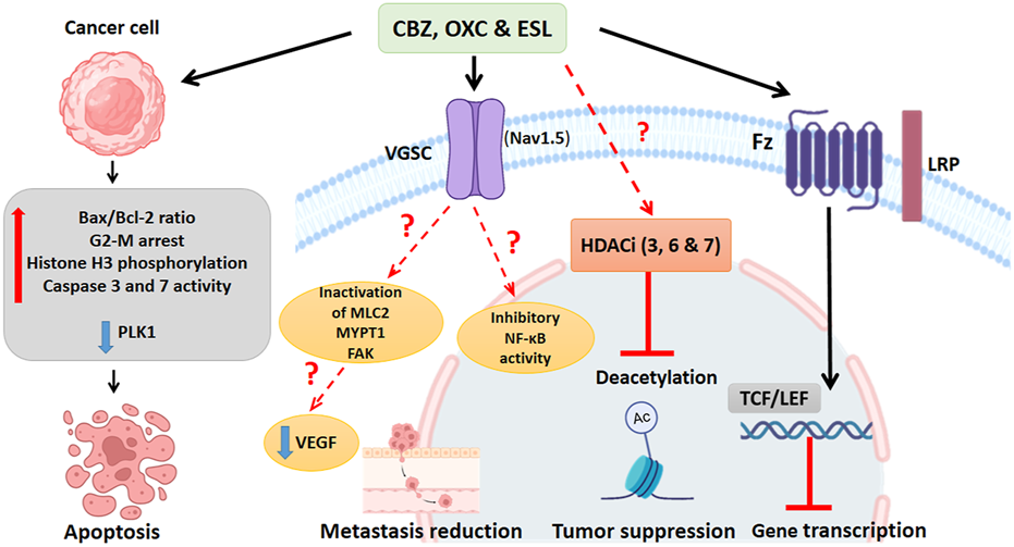 Figure 4. Summary of known actions of dibenzazepines in cancer. Cancer cells exposed to dibenzazepines increase the ratio of Bax/Bcl2 ratio and caspase 3 and 7, induce G2-M cell cycle arrest, enhance histone H3 phosphorylation, and decrease the activity of PLK1, all leading to apoptotic signaling. Dibenzazepine’s action through VGSCs with unknown mechanisms leads to a decrease in the NF-kB activity, MLC2, MYPT1, and FAK lead to a reduction in metastasis of cancer cells treated with these drugs. Also, dibenzazepines reduce VEGF levels. Dibenzazepines also inhibit the deacetylation of chromatin by inhibiting histone deacetylases (3, 6, and 7) and suppress tumor growth. They also inhibit the Wnt/β-catenin pathway by binding to the FZ receptor and finally inhibit gene transcription. NF-kB: Nuclear factor kappa-light-chain-enhancer of activated B cells, PLK1: Polo-like kinase 1, MLC2: myosin light chain 2, MYPT1: myosin phosphatase 1 target subunit 1, FAK: focal adhesion kinase, LRP: Lipoprotein receptor-related proteins, FZ:N-terminal extra-cellular cysteine-rich domain of a Frizzled, TCF/LEF: T cell factor/lymphoid enhancer factor. By Biorender.com.