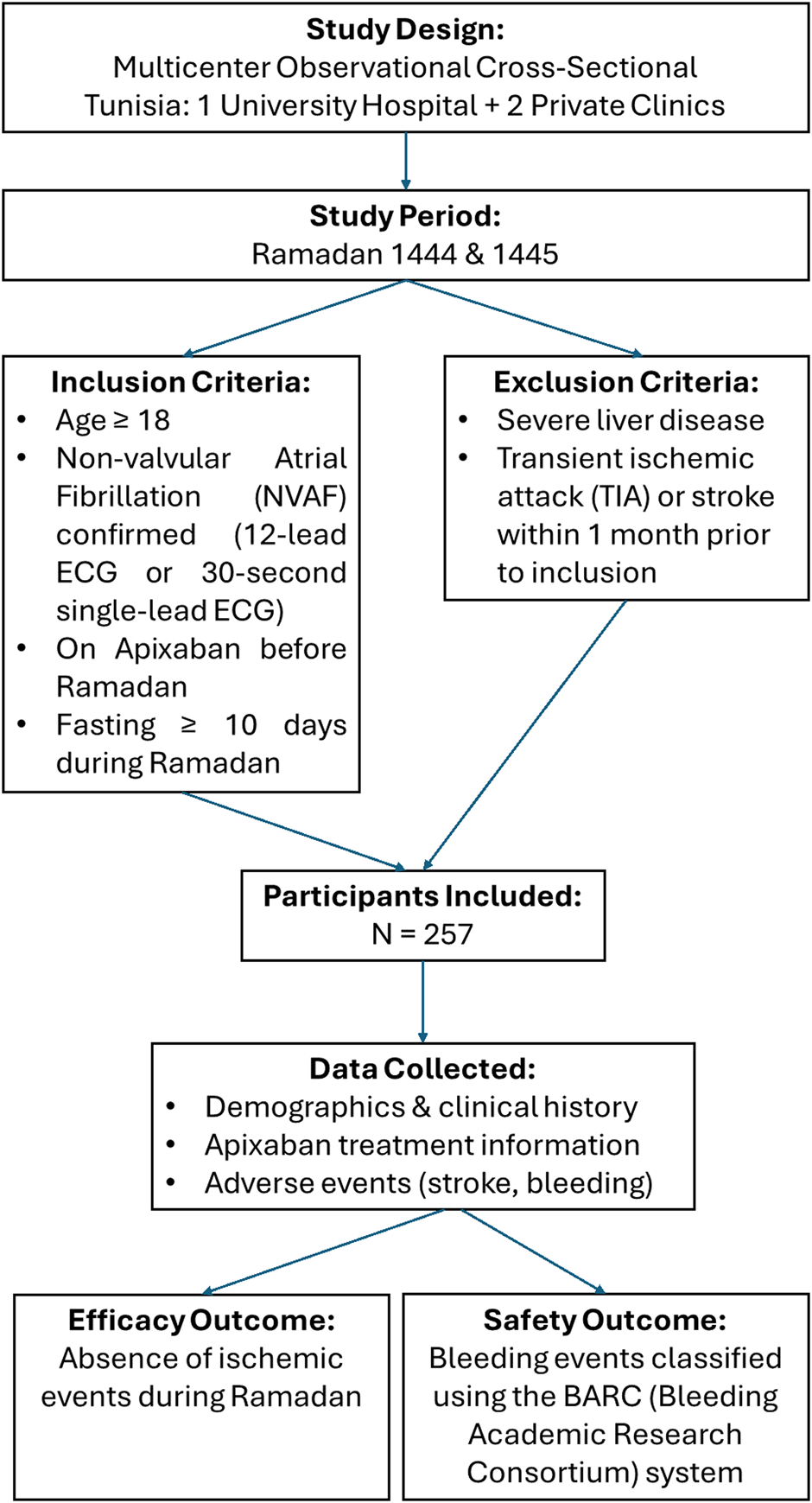 An observational, multicentric study was performed in Tunisia during two consecutive years during the specific month of Ramadan. The API-RAM study included AF patients who were on apixaban and fasted at least 10 days. Efficacy was defined by the absence of ischemic events, and safety was established by classifying bleeding events using the BARC (Bleeding Academic Research Consortium) classification during the study period.