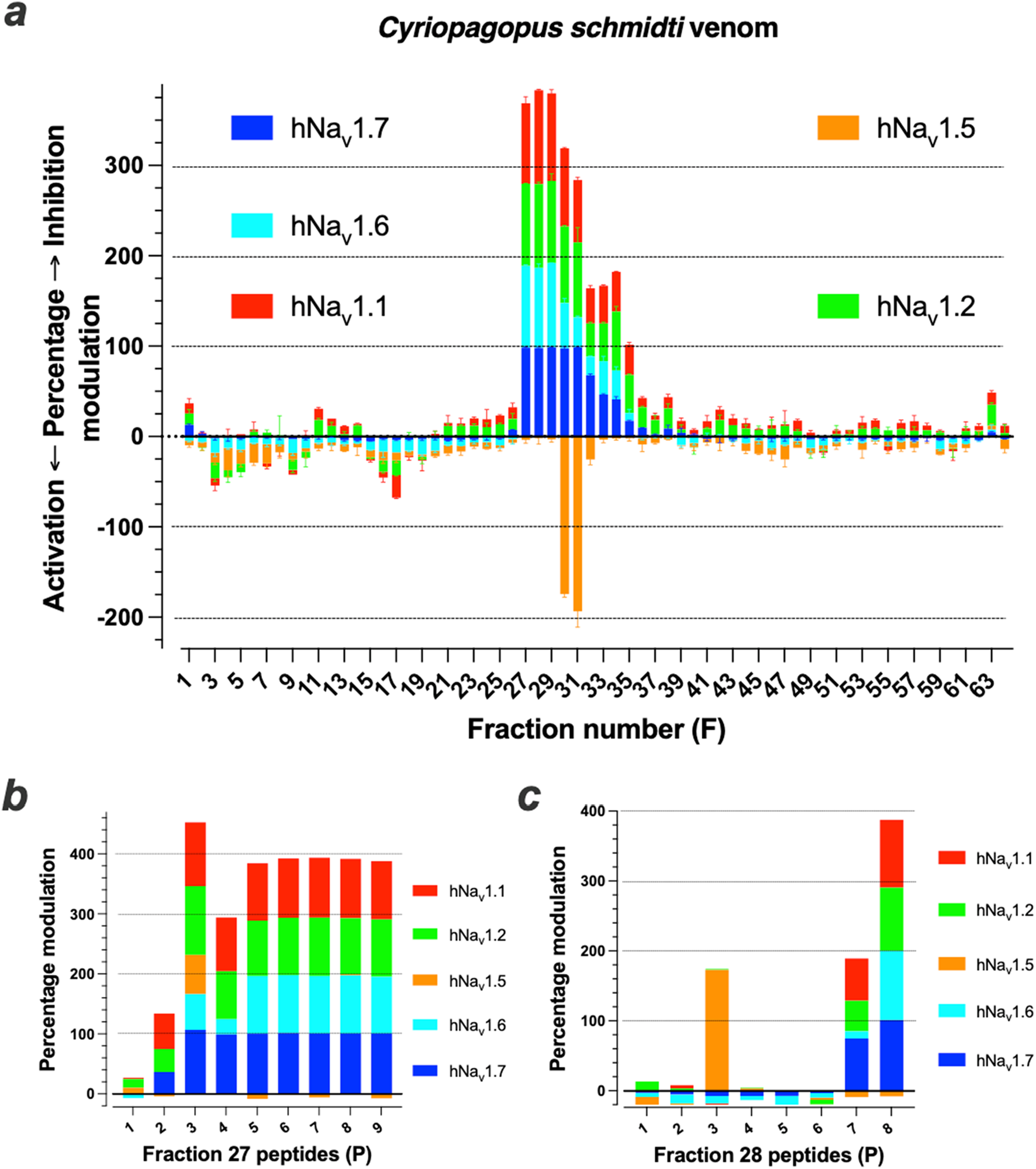 Screening of Cyriopagopus schmidti spider venom onto hNav1.1, hNav1.2, hNav1.5, hNav1.6 and hNav1.7 isoforms. (a), Screening results of primary RP-HPLC F1 to F64 onto the five hNav isoforms. (b, c), Tests of nine and eight purified compounds from F27 (b) and F28 (c), respectively, onto the five hNav isoforms. By convention, positive Y-axis values are Na+ influx inhibitors, while negative ones are Na+ influx activation.