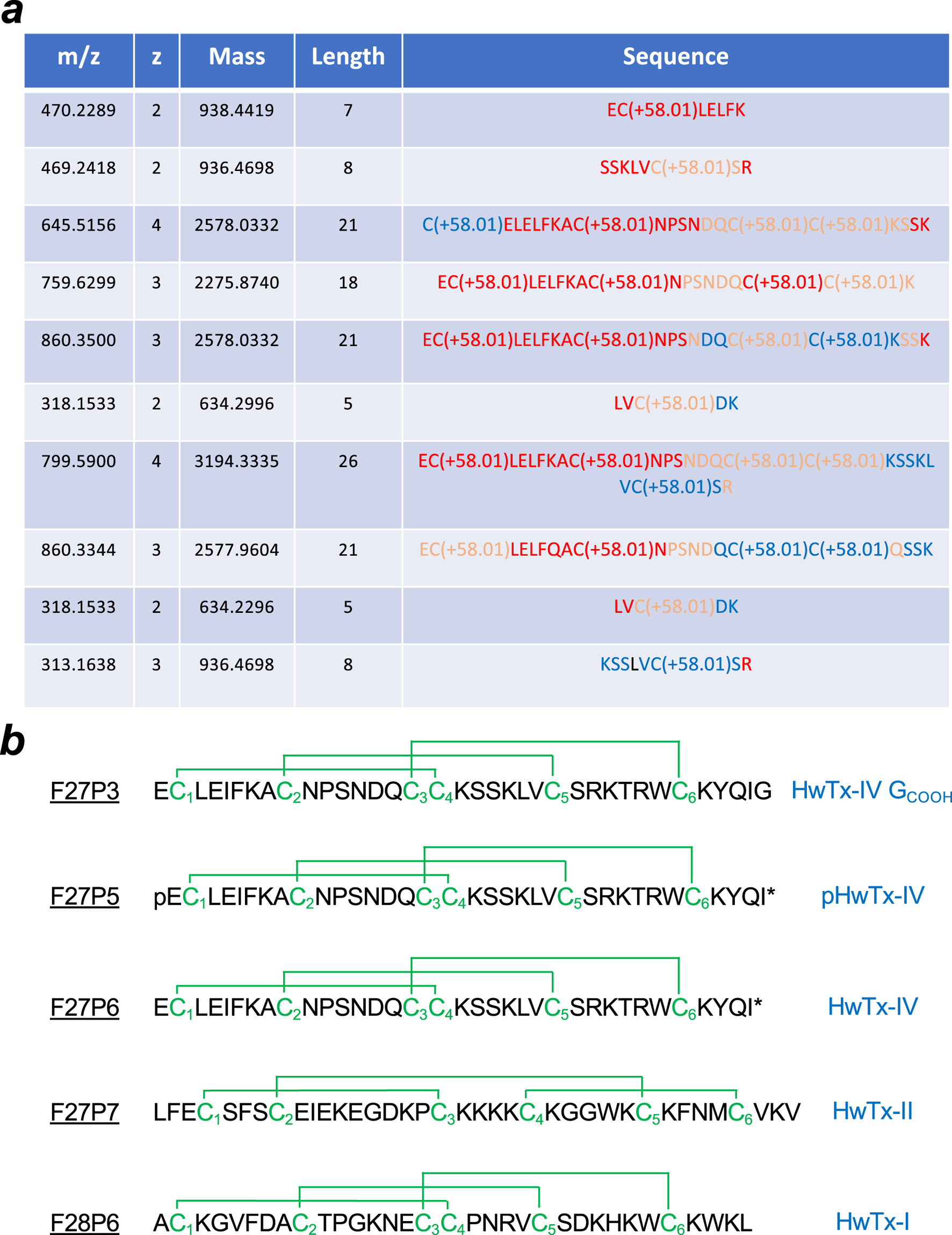 Amino acid sequencing of the five peptides regulating hNav channel activity. (a), Partial sequences obtained from MS/MS data on F27P3 peptides following reduction, alkylation by iodoacetamic acid and trypsin digestion. The table has been built based on the results of de novo sequencing by the version 5.2 Peaks™ software (Bioinformatics Solutions Inc.) with the following settings: trypsin enzyme and carboxymethylation (C) as fixed modifications; mass accuracy on fragment ions at 0.1 Da; mass accuracy for the precursor mass at 10 ppm. Code color for the reliability index: red (>90%), salmon (80%–90%) and blue (60%–80%). (b), Reconstructed sequences of the five peptides along with consensus disulfide bridging pattern. Known nomenclature is given right next to the sequences. Three out of four peptides were identified earlier. pHwTx-IV is a pyroglutamate at position one instead of glutamate.