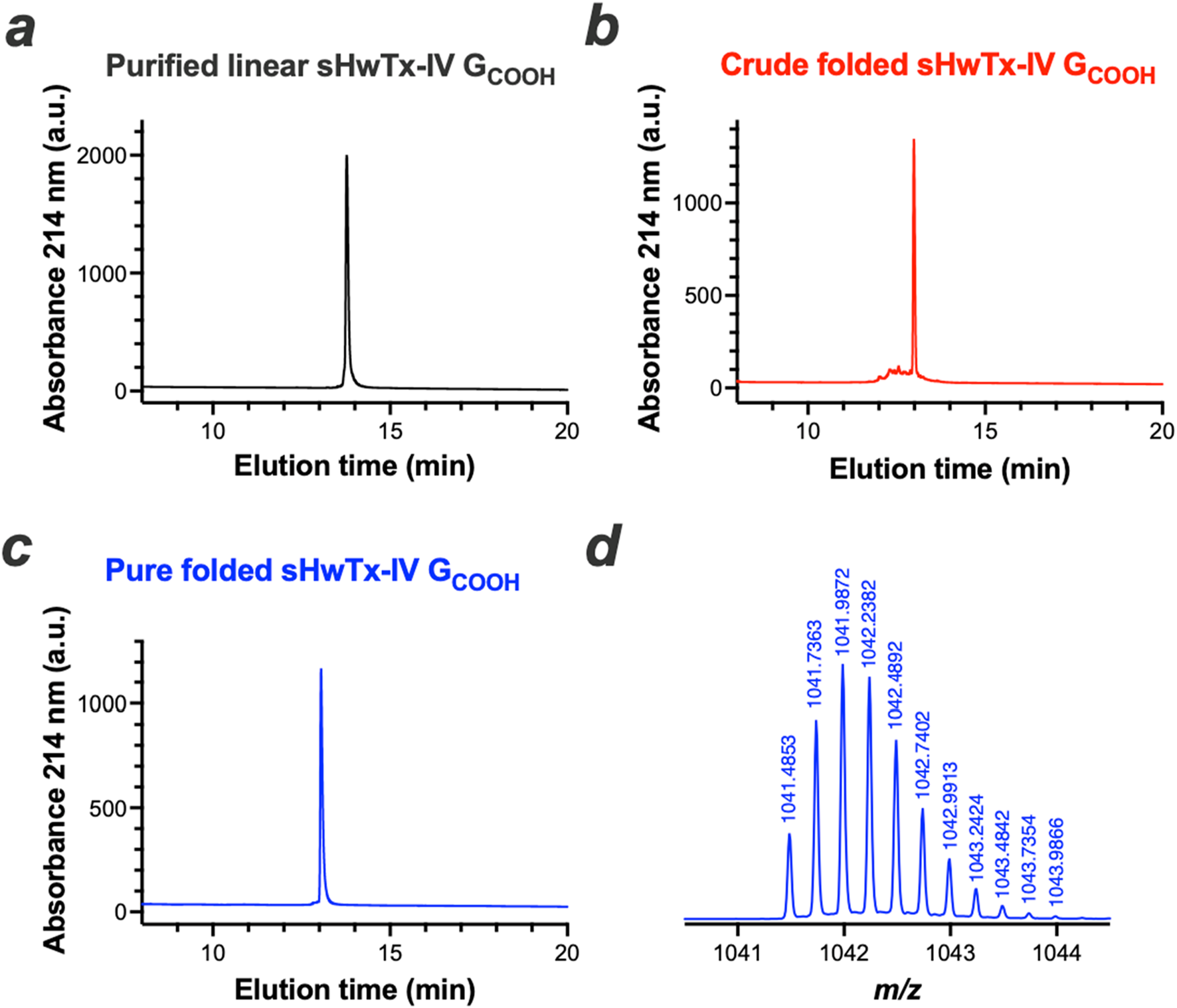 Chemical synthesis of sHwTx-IV GCOOH. (a-c), RP-HPLC elution profiles of purified linear (a), crude folded/oxidized (b) and pure folded/oxidized sHwTx-IV GCOOH(c, d), [M+4H]4+ mass spectrum of purified folded/oxidized sHwTx-IV GCOOH.