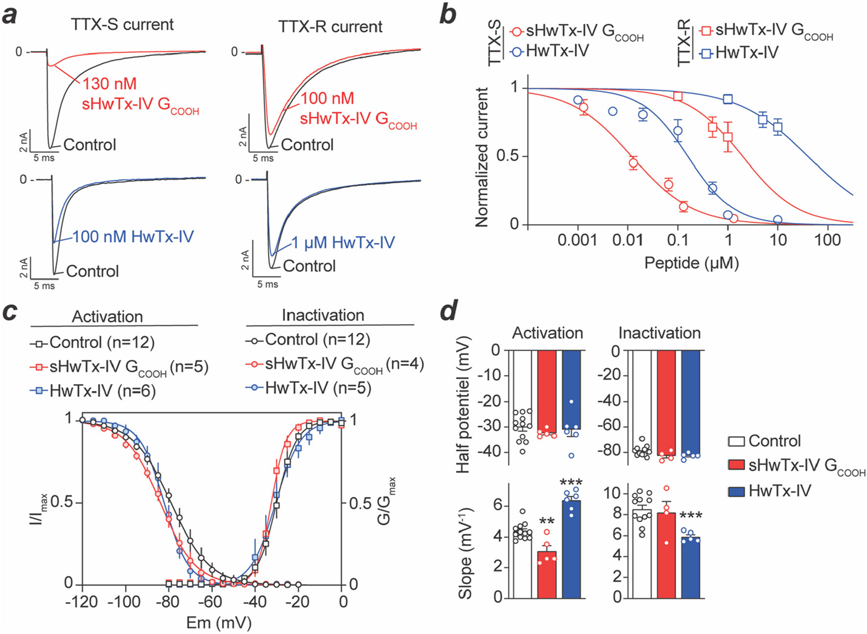 Lyophilized synthetic (s) HwTx-IV GCOOH (molecular weight of 4164.82 Da, purity rate >97%, Smartox Biotechnology, Saint-Egrève, France), HwTx-IV (molecular weight of 4107.20 Da, purity rate >97%; Smartox Biotechnology, Saint-Egrève, France) and TTX citrate (molecular weight of 319.27 Da, purity rate >98%; Sigma-Aldrich, Saint-Quentin Fallavier, France) were dissolved in PBS +0.1% BSA (for sHwTx-IV GCOOH and HwTx-IV) or with 10% phosphate buffer (for TTX), to give stock solutions of 1 mM, 6.1 mM and 6 mM, respectively, and stored at −20°C. Successive dilutions were then performed in the adequate medium (PBS +0.1% BSA or standard physiological medium), prior to experiments, to give the final toxin concentrations/doses indicated in the text.