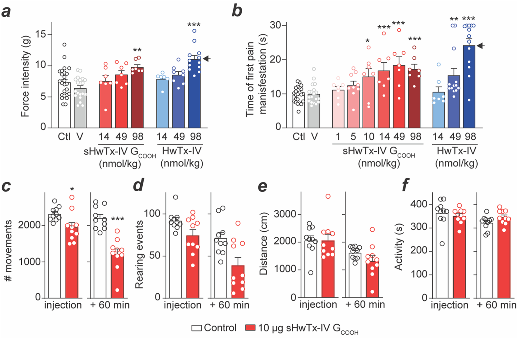 Effects of sHwTx-IV GCOOH and HwTx-IV on tactile and heat sensitivity of mice in vivo. (a), Tactile sensitivity of mice was assessed using the automated plantar von Frey apparatus, by determining the force intensity at which the animals removed their hind limb submitted to an increasing fibre pressure. The same mice were tested before (no injection) and after intraplantar injection of vehicle (maximum 15 µL of PBS +0.1% BSA), sHwTx-IV GCOOH (14–98 nmol/kg) or HwTx-IV (14–98 nmol/kg). (b), The heat sensitivity of mice was assessed using a hot-plate set at 55.0°C ± 0.2°C, by determining the latency for the animals to shake the right hind limb. Ten groups of minimum six mice were tested after intraplantar injection of vehicle, sHwTx-IV GCOOH (1–98 nmol/kg) or HwTx-IV (14–98 nmol/kg), while an 11th group of animals was tested without any injection. *: P < 0.05, **: P < 0.01 and ***: P < 0.001 versus vehicle-injected mice. The black arrow indicates motor impairment of all injected mice. Peptide concentration injected was equivalent to 3 μM (1 nmol/kg) up to 294 μM (98 nmol/kg). (c), Number of mice movements during the first 10 min after intraperitoneal injection of 10 μg sHwTx-IV GCOOH injection or after 60 min compared to control. *: P < 0.05 and ***: P < 0.001 versus vehicle-injected mice. (d), Number of rearing events immediately after and 60 min after intraperitoneal injection of 10 μg sHwTx-IV GCOOH. (e), Distance travelled by mice for the two times post-injection of 10 μg sHwTx-IV GCOOH. (f), Activity duration of the mice for the two times post-injection of 10 μg sHwTx-IV GCOOH.
