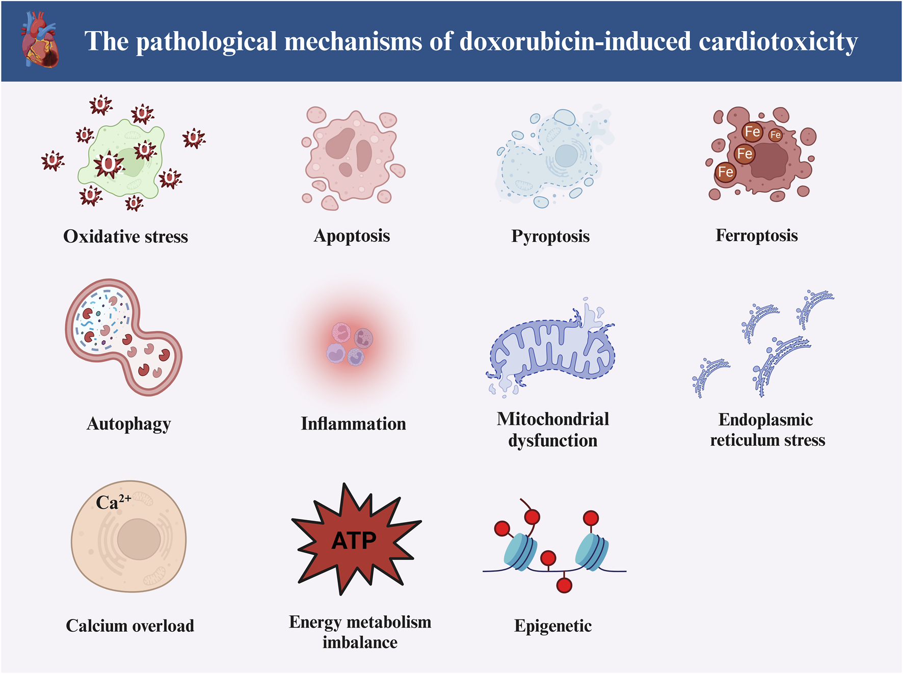 Figure 1. The main pathological mechanisms of doxorubicin-induced cardiotoxicity. Doxorubicin-induced cardiotoxicity involves multiple pathological mechanisms. The main can include oxidative stress, apoptosis, ferroptosis, pyroptosis, autophagy, inflammation, endoplasmic reticulum stress, epigenetics, Ca2+ overload, disturbed energy metabolism and mitochondrial dysfunction (Created with BioRender.com).