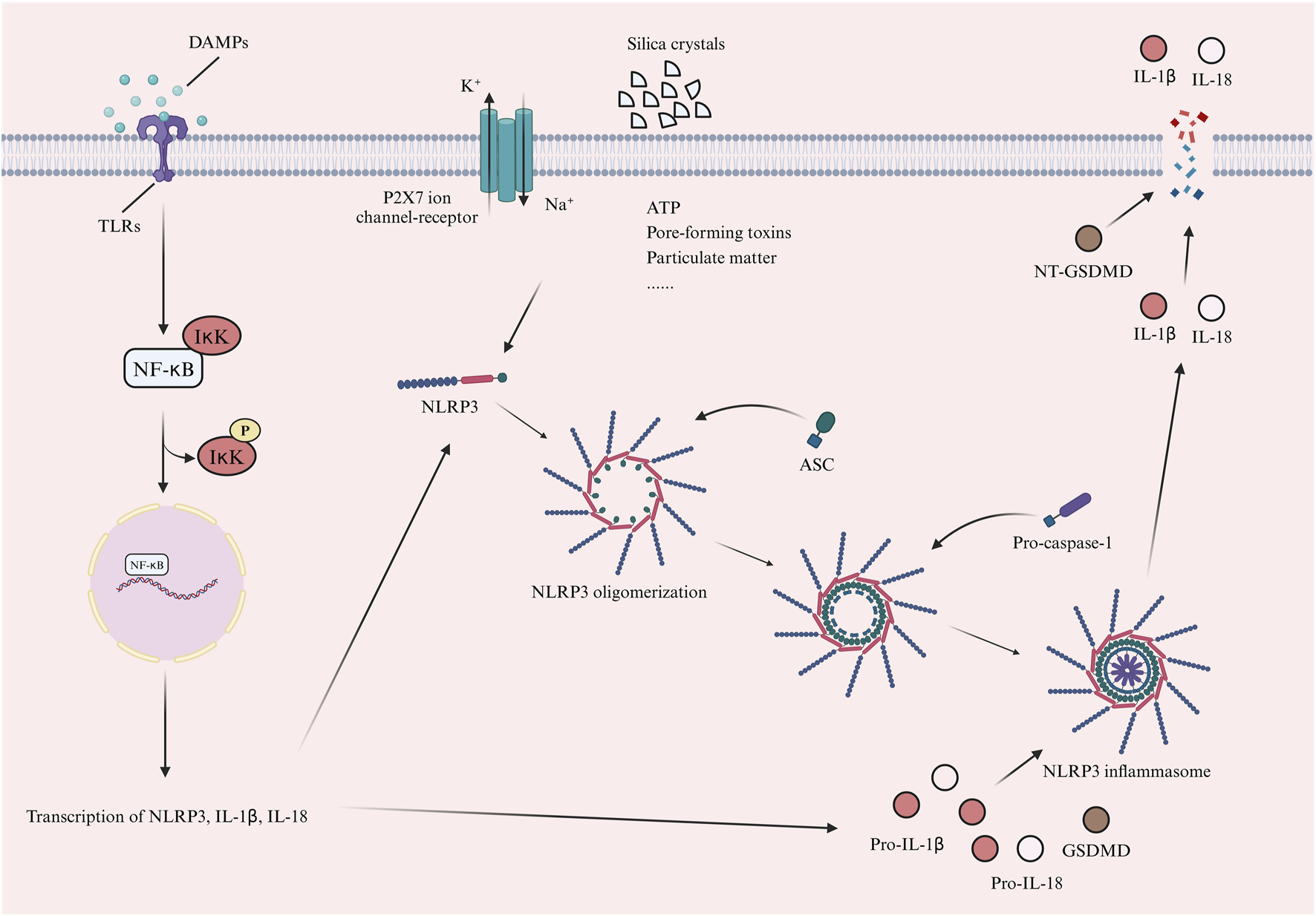 Figure 2. The activation process of NLRP3 inflammasome. The activation of NLRP3 inflammasome depends on two main signals. First is the “priming” signal. This signal is primarily mediated by a variety of PRRs, including TLRs. These receptors recognize PAMPs or DAMPs, thereby triggering the nuclear translocation of NF-κB. This process subsequently induces the transcription of NLRP3, IL-1β, and IL-18. The next is the “triggering” signal. The signal promotes NLRP3 oligomerization and NLRP3 interacts with ASC. ASC binds to pro-caspase-1 to form the NLRP3 inflammasome. Pro-caspase-1 is cleaved into active caspase-1, which activates pro-IL-1β, pro-IL-18 and GSDMD. Activated NT-GSDMD forms membrane pores, releasing IL-1β and IL-18 and inducing pyroptosis. This signal is triggered by factors like ion flow (K+ efflux, Na+ influx), ATP, pore-forming toxins, particulate matter and silica crystals (Created with BioRender.com). (PRRs, pattern recognition receptors; PAMPs, pathogen-associated molecular patterns; DAMPs, damage-associated molecular patterns; TLRs, toll-like receptors; NF-κB, nuclear factor kappa B; IκK, IkappaB kinase; IL-1β, interleukin-1beta; NLRP3, nod-like receptor family pyrin domain-containing 3; ASC, apoptosis-associated speckle-like protein; GSDMD, gasdermin-D; ATP, adenosine triphosphate; P2X7, purinergic 2X7).