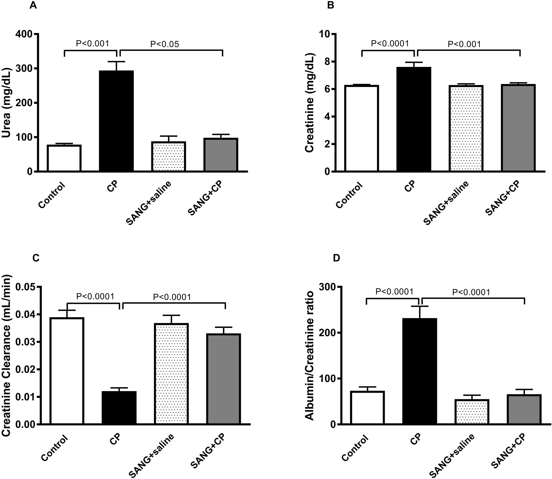 In Figure 2, the concentrations of urea (p < 0.001) and creatinine (p < 0.0001) in plasma showed significant elevation in groups treated with CP compared with the control. This elevation, however, was significantly abrogated when SANG was given alongside CP (p < 0.05 and p < 0.001). Mice treated with CP showed reduced kidney function, as evidenced by a significant reduction in creatinine clearance (p < 0.0001) compared with the control group. In addition, they also had a significant increase in albumin to creatinine ratio (p < 0.0001) as opposed to the control. The co-treatment with SANG, however, normalized these biochemical alterations (p < 0.0001 and p < 0.0001).