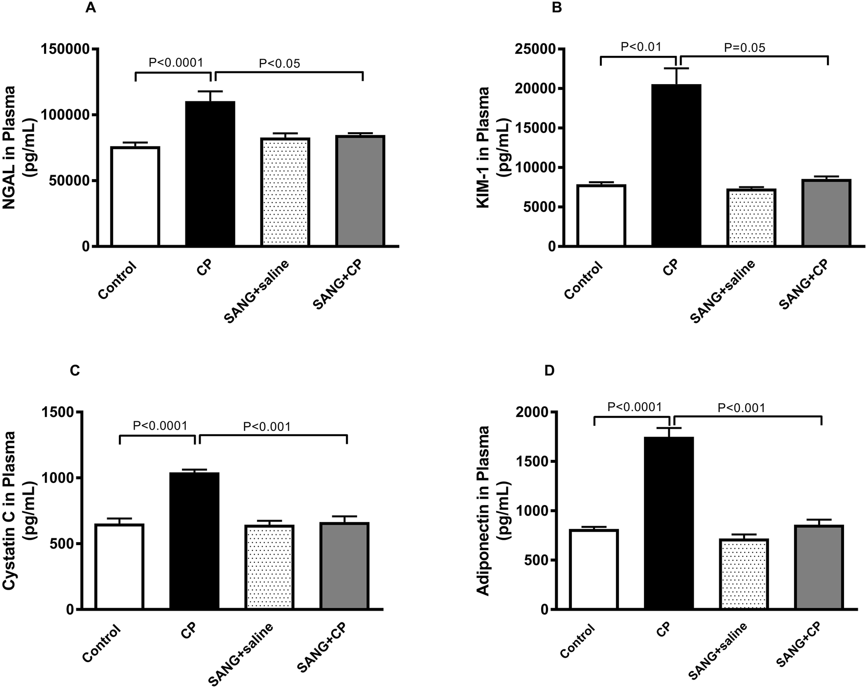 Figure 3 illustrates the changes in the levels of markers of kidney injury in the plasma across all four groups. The concentrations of NGAL (p < 0.0001), KIM-1 (p < 0.01), cystatin c (p < 0.0001), and adiponectin (p < 0.0001) were significantly increased when mice were given a single IP injection of 20 mg/kg CP. Nonetheless, when SANG was given concomitantly with CP, the plasma concentrations of these markers were significantly reduced (p < 0.05, p = 0.05, p < 0.001, and p < 0.001, respectively) when compared with the control group.