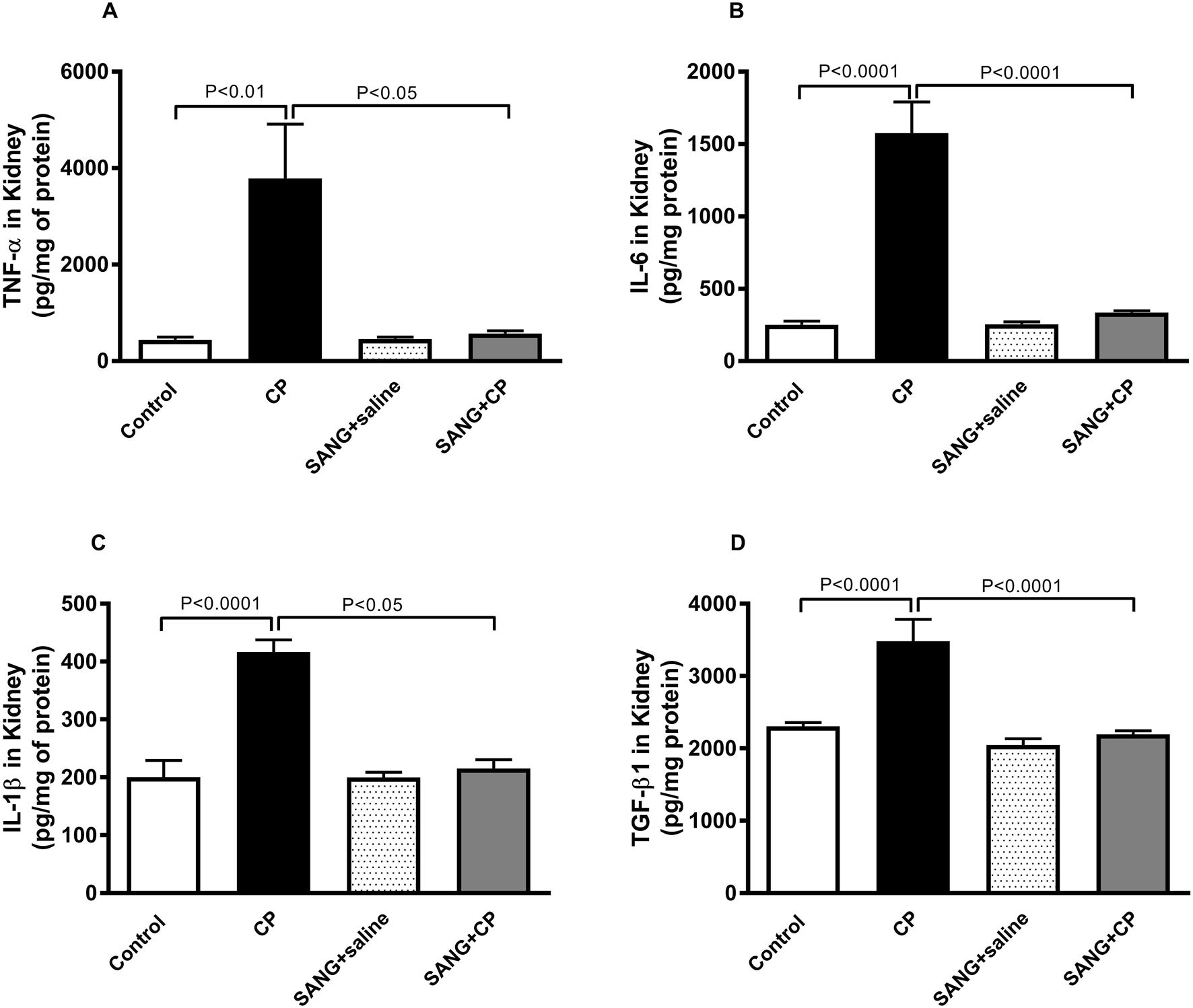 As shown in Figure 4, the concentrations of TNFα (p < 0.01), IL-6 (p < 0.0001), IL-1β (p < 0.0001), and TGF-β1 (p < 0.0001) in kidney homogenates were significantly augmented in CP-treated group compared with the control animals. These augmentations, however, were mitigated at a significant level when mice were co-treated orally with 5 mg/kg SANG (p < 0.05, p < 0.0001, p < 0.05, and p < 0.0001, respectively).