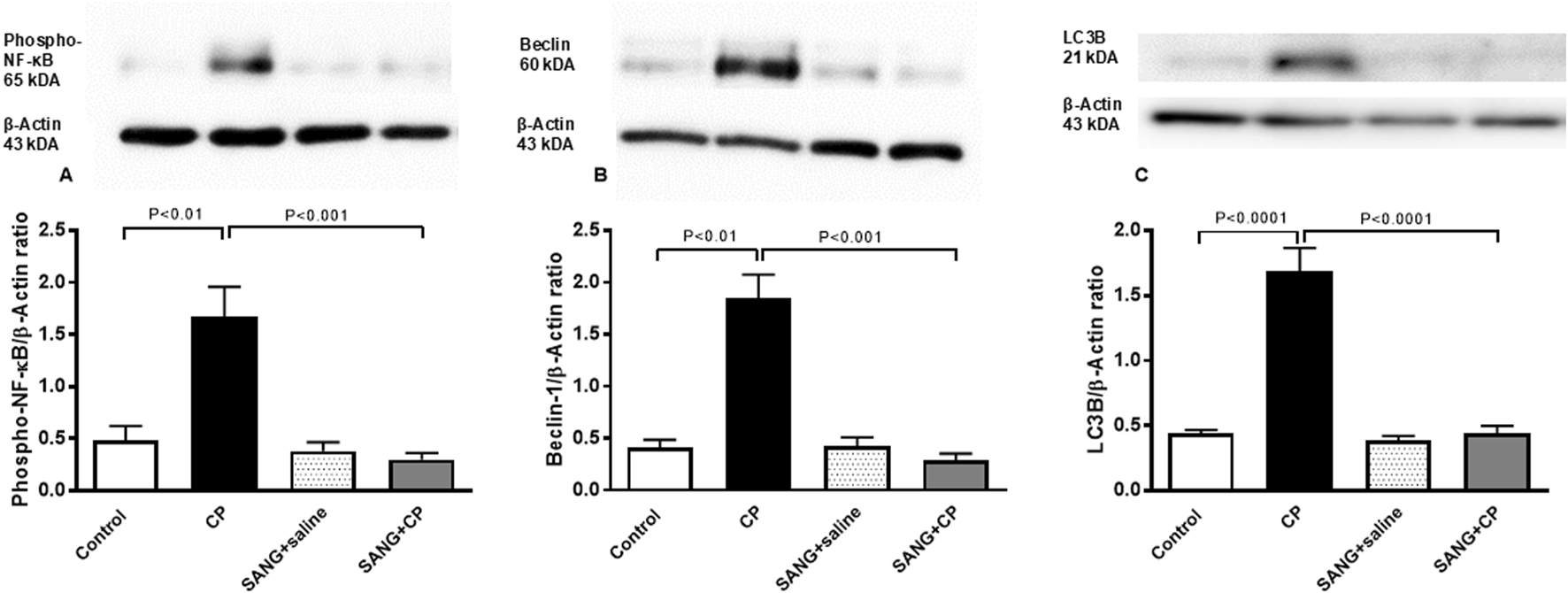 Figure 8 illustrates that the protein expressions of phospho-NF-κB (p < 0.01), beclin-1 (p < 0.01), and LC3B (p < 0.0001) in kidney homogenates of mice treated with CP were significantly higher compared with the control mice. The treatment with SANG significantly reversed the overexpression of these proteins (p < 0.001, p < 0.001, and p < 0.0001, respectively).
