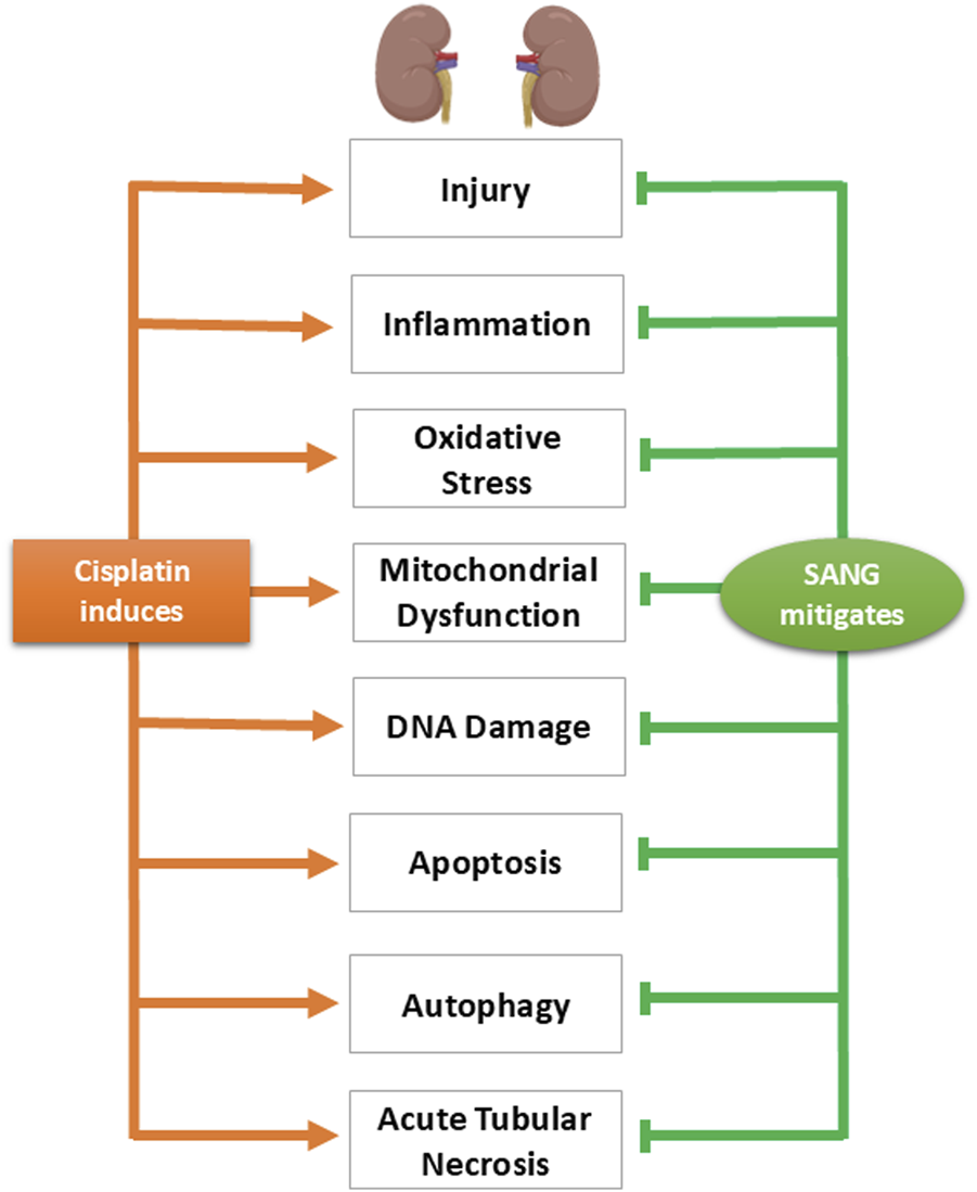 Therefore, since oxidative stress and inflammation are well-established factors in the etiology of CP-induced AKI (Pabla and Dong, 2008; Qi et al., 2023; McSweeney et al., 2021) and SANG has previously been shown to have strong antioxidant and anti-inflammatory capabilities, we thought that it would be useful to study the effect of SANG in CP-induced AKI, a study that, to our knowledge, has not been reported yet. Here, we aim to evaluate the potential salutary effects of SANG in ameliorating the CP-induced AKI in mice, by assessing various markers of oxidative stress, inflammation, mitochondrial dysfunction, DNA damage, apoptosis, and autophagy.
