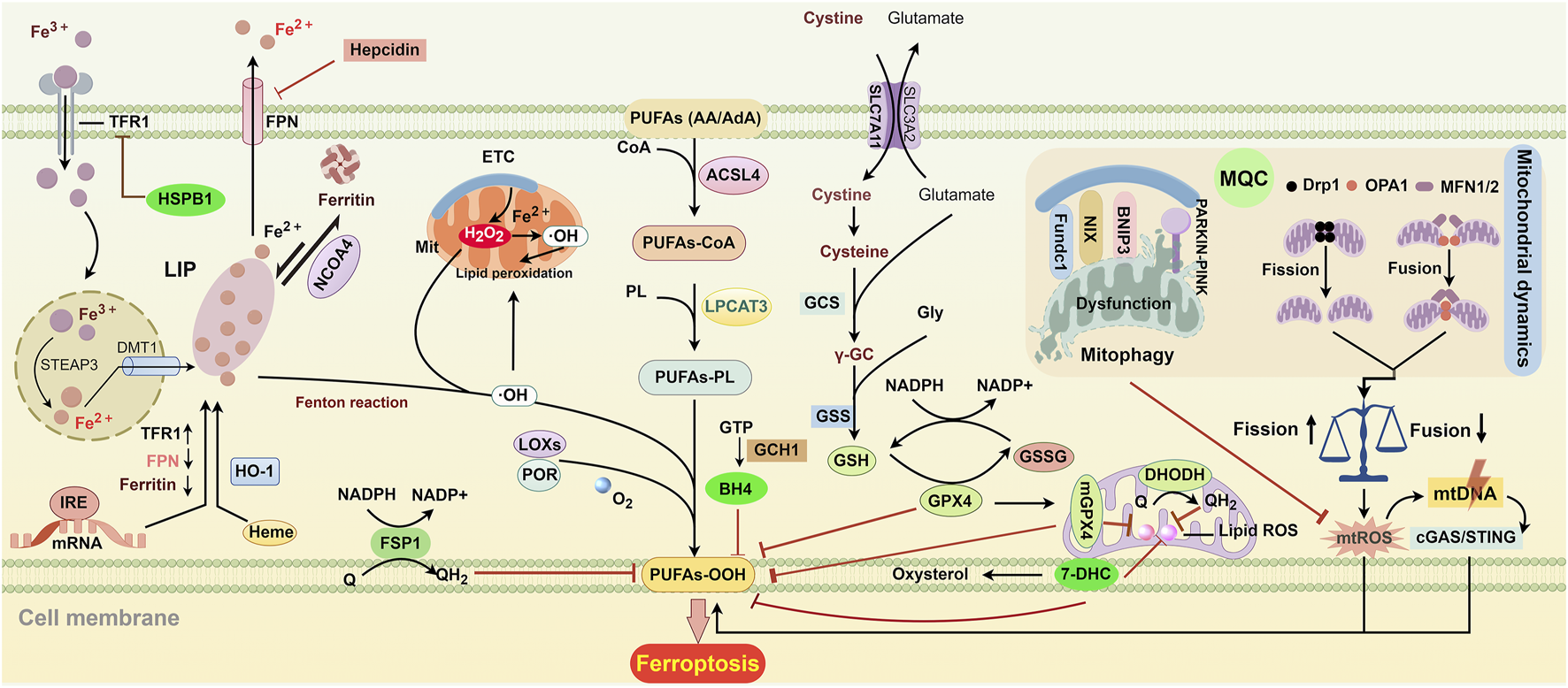 Key regulatory pathways of ferroptosis. ACSL4 and LPCAT3 initiate the biosynthesis of PUFA-PL by incorporating and esterifying PUFAs into phospholipids. Extracellular Fe3+ enters cells through TFR-mediated endocytosis. Once inside, it is reduced to Fe2+ by the enzyme STAEP3 and then transported to the cytoplasm by DMT1. After the release into the cytoplasm, free iron enters the cytosolic labile iron pool (LIP). Fe2+ from the LIP can be stored in ferritin and can be released again through NCOA4-mediated degradation. FPN is responsible for exporting iron to the extracellular space. IRE controls the translation of iron metabolism-related mRNA, including FPN, ferritin, and TFR. The levels of TFR and FPN can also be regulated by HSPB1 and hepcidin, respectively. HO-1 converts heme into biliverdin and iron, which raises intracellular iron levels. Electron leakage from the, ETC., generates O2·− and H2O2, leading to the formation of OH· through Fenton action, which accelerates lipid peroxidation in cellular and mitochondrial membranes. Additionally, LOXs and POR can promote lipid peroxidation by converting PUFAs into hydroperoxides. SLC7A11-mediated cystine transport enhances the synthesis of GSH. GPX4 uses GSH to protect cells from lipid peroxidation and ferroptosis. GSH can enter the mitochondria to form mGPX4, which collaborates with DHODH to help prevent ferroptosis. 7-DHC protects lipids from autoxidation in plasma and mitochondria and prevents ferroptosis. FSP1 is primarily located in plasma membranes, where it converts Q into QH2 to eliminate harmful lipid peroxides. GCH1 suppresses ferroptosis by generating the antioxidant BH4. Mitochondrial dynamics and mitophagy are essential for mitochondrial quality control (MQC). Disruption of MQC can lead to ferroptosis by increasing mtROS, which damages mtDNA. This damaged mtDNA can enter the cytosol and trigger lipid peroxidation through the mtDNA/cGAS/STING pathway. Abbreviations: ACSL4, acyl-CoA synthetase long-chain family member 4; BH4, tetrahydrobiopterin; cGAS/STING, cyclic GMP-AMP synthase-stimulator of interferon genes; 7-DHC, 7-Dehydrocholesterol; DHODH, dihydroorotate dehydrogenase; DMT1, divalent metal transporter 1; Drp1, dynamin-related protein 1; FPN, ferroportin; FSP1, ferroptosis suppressor protein 1; Fundc1, FUN14 domain containing 1; GCH1, GTP cyclohydrolase 1; GPX4, glutathione peroxidase 4; GSH, glutathione; GSSG, glutathione disulfide; HO-1, heme oxygenase 1; IRE, iron response element; HSPB1, heat shock protein beta-1; LOXs, lipoxygenase; LPCAT3, lysophosphatidylcholine acyltransferase 3; MFN1/2, mitofusin-1/2; mGPX4, mitochondrial glutathione peroxidase 4; mtDNA, mitochondrial DNA; NADPH, nicotinamide adenine dinucleotide phosphate; NCOA4, nuclear receptor coactivator 4; OPA1, optic atrophy protein 1; PARKIN, Parkin RBR E3 ubiquitin-protein ligase; PINK1, PTEN-induced kinase 1; PL, phospholipid; POR, P450 oxidoreductase; PUFAs, polyunsaturated fatty acids; Q, ubiquinol; STEAP3, six-transmembrane epithelial antigens of the prostate 3; TFR, transferrin receptor.