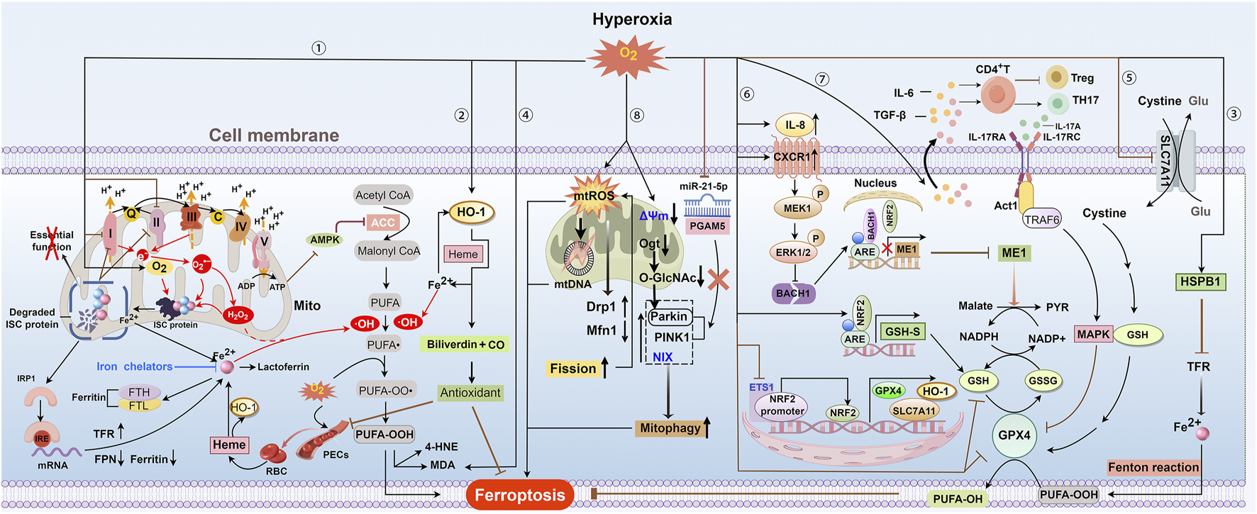 Overview of ferroptosis in hyperoxia. ① and ② Hyperoxia can decrease ATP production by inhibiting oxidative phosphorylation driven by the ETC. This may inhibit ACC by activating AMPK activity through the sensing of the ADP: ATP ratio, which further reduces the synthesis of PUFAs. Hyperoxia disrupts complexes I and II of the ETC, leading to increased production of O2·− and H2O2 due to electron leakage. These reactive species, along with oxygen, can degrade ISC-containing protein complexes, inactivating crucial enzymes and releasing iron. The loss of ISC proteins exacerbates, ETC, dysfunction, further elevating levels of O2·− and H2O2 and causing constant damage to ISC proteins. Reduced ISC levels can boost IRP1 binding to IREs, leading to increased cellular iron uptake by raising TFR expression and lowering ferritin and FPN expression. Excessive H2O2 promotes the generation of OH· through Fenton reactions and increases the peroxidation of PUFAs in plasma and mitochondrial membranes, ultimately leading to ferroptosis. Exposure to hyperoxia increases the vascular permeability of PECs and leads to the leakage of RBCs and their degradation into heme. The heme-induced HO-1 catabolizes heme to iron HO-1, thereby increasing intracellular iron levels. To reduce HLI, excessive iron can enhance HO-1 gene expression and increase ferritin and lactoferrin levels during hyperoxia, thereby providing an antioxidant effect by producing biliverdin. Excess iron increases HO-1 gene expression, producing biliverdin for antioxidant effects, and raises ferritin and lactoferrin levels during hyperoxia, potentially helping to reduce HLI. HO-1 gene expression can also be induced by hyperoxia itself to exert antioxidant effects. ③ Increased oxygen levels enhance HSPB1 mRNA, which may reduce cellular iron by suppressing TFR expression and thus limit ferroptosis. ④ and ⑤ Hyperoxia exposure will inhibit the SLC7A11-GPX4 axis and increase MDA levels, thereby promoting lipid peroxidation. ⑥ Hyperoxia elevates BACH1 expression, which competes with NRF2 for ME1 promoter binding and transcription. This limits malate oxidation to pyruvate and NADPH-dependent GSH production. Hyperoxia suppresses the ETS1/Nrf2 pathway, resulting in decreased levels of downstream antioxidant components such as HO-1, SLC7A11, and GPX4. Hyperoxia might enhance GSH synthesis via the Nrf2-GSH synthetase pathway as a compensatory mechanism. ⑦Hyperoxia induces HALI by initiating IL-17A-mediated ferroptosis in AEC II through the downregulation of GPX4 via the Act1-TRAF6-p38 MAPK pathway. ⑧ Hyperoxia increases the production of mtROS and causes mtDNA damage, which raises sensitivity to ferroptosis. Additionally, mtROS enhances mitochondrial fission by increasing Drp1 and decreasing Mfn1, causing mitochondrial fragmentation and more mtROS production, which in turn accelerates lipid peroxidation and ferroptosis. Hyperoxic exposure leads to the dissipation of mitochondrial membrane potential (Δψ), loss of ATP, and a burst of ROS. Hyperoxia reduces Ogt and O-GlcNAc levels, enhancing Parkin-dependent mitophagy and HLI. PINK1/Parkin and NIX-mediated mitophagy under hyperoxia contribute to BPD pathogenesis and impaired alveolar development. Hyperoxia reduces miR-21–5p levels, enhancing mitophagy and worsening acute lung injury by directly affecting the PGAM5-related PINK1/Parkin pathway. Abbreviations: AMPK, adenosine monophosphate-activated kinase; ARE, antioxidant response element; C, cytochrome c; CXCR1, C-X-C motif chemokine receptor 1; ETS1, E26 oncogene homolog 1; FTH and FTL, heavy and light ferritin chains; GSH-S, GSH synthetase; 4-HNE, 4-hydroxynonenale; IRE, iron response element; IRP, iron regulatory protein; ISC, iron-sulfur cluster; MAPK, p38 mitogen-activated protein kinase; MDA, malondialdehyde; ME1, malic enzyme 1; Ogt, O-GlcNAc transferase; PECs, pulmonary endothelial cells; PYR, pyruvate; RBC, red blood cell.