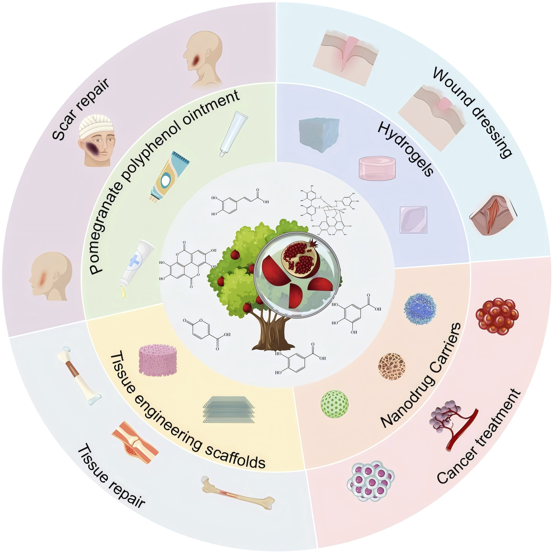 Pomegranate peel is not without value but possesses unique medicinal properties. Thousands of years ago, pomegranate peel was widely used in traditional medicine across many cultures (Li et al., 2006; Liu et al., 2012). Historically, pomegranate peel has been utilized in various cultures for medicinal purposes. The Romans employed it as an anthelmintic, while some ethnic groups in the Middle East and South America have used boiled pomegranate peel for treating dysentery (Ge et al., 2021; Longtin, 2003). In traditional Chinese medicine, pomegranate peel is regarded as a potent astringent and anti-inflammatory agent, applied to treat traumatic bleeding, infections, and gastrointestinal disorders such as diarrhea (Mo et al., 2013). In Ayurvedic medicine, it is similarly valued as an effective remedy for oral infections (Rafey et al., 2021). In modern times, the medicinal efficacy of pomegranate peel has been scientifically validated. Studies reveal that pomegranate peel is rich in bioactive metabolites such as tannins, phenolic acids, and flavonoids, which impart a range of pharmacological effects, including antioxidant, anti-inflammatory, antibacterial, and anticancer activities (Ain et al., 2023; Ozkan, 2023; Siddiqui et al., 2024). Research has demonstrated that the antioxidant capacity of pomegranate peel extract (PPE) is nearly ten times greater than that of other parts of the pomegranate fruit, a property closely linked to its polyphenolic structure (Hanafy et al., 2021). Furthermore, PPE is capable of modulating several critical molecular pathways, including mitogen-activated protein kinases, nuclear factor-kappa B (NF-κB), cysteine-aspartic acid-specific proteases, and peroxisome proliferator-activated receptors, thus providing theoretical support for its use in the treatment of a variety of diseases (Andishmand et al., 2025). In addition to its notable pharmacological properties, PPE can be processed into nanodrug carriers, hydrogels, and other biomedical materials through chemical reduction, complexation, emulsification, and hydration methods, offering potential therapeutic applications for diseases such as diabetes and breast cancer (Andishmand et al., 2023; Askari and Nikoonahad Lotfabadi, 2020; Baccarin and Lemos-Senna, 2017; Ganeshkumar et al., 2013; Savekar et al., 2024; Tiyaboonchai et al., 2015). Thus, utilizing pomegranate peel, a by-product, can achieve resource recycling and create new economic value.