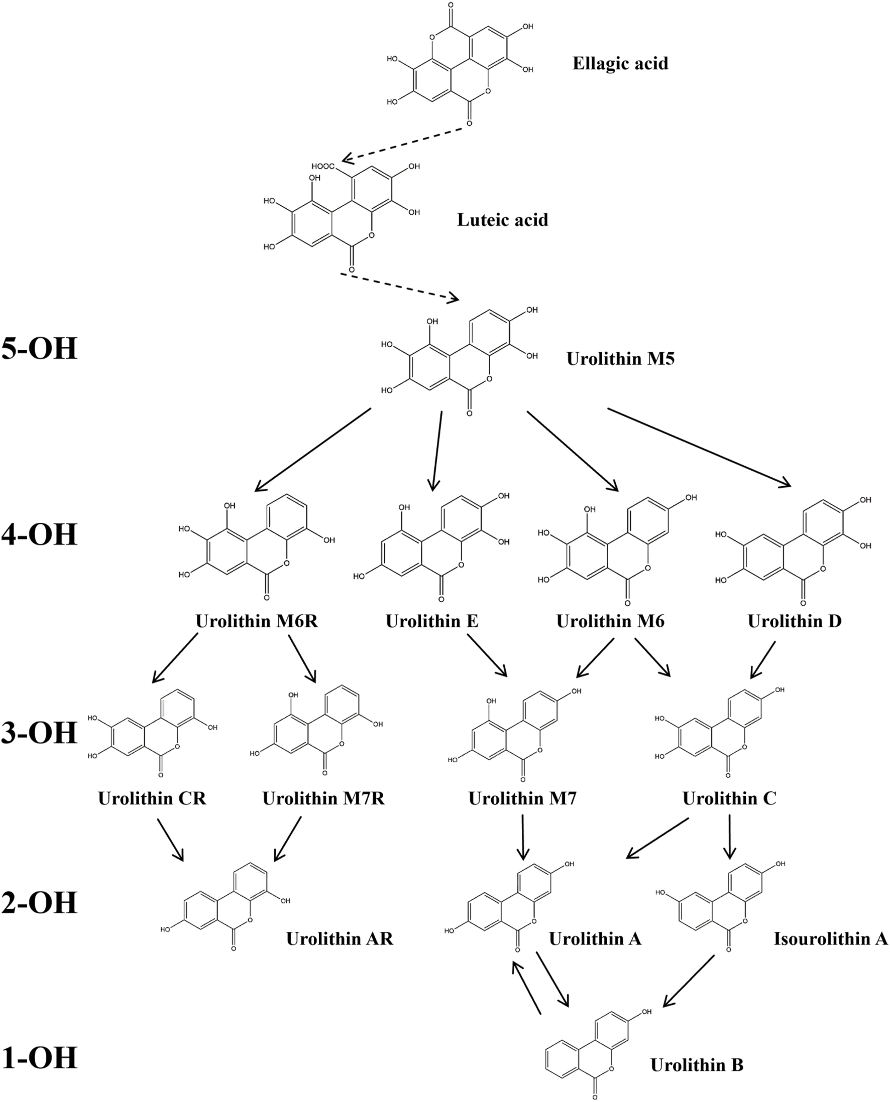 Degradation Pathway of ellagic Acid Metabolism into Uros. In the figure, Uros are classified based on the number of hydroxyl groups (5-OH, 4-OH, 3-OH, 2-OH, 1-OH), and the final products include urolithin A, urolithin B, and Isourolithin A (Xiang et al., 2022).
