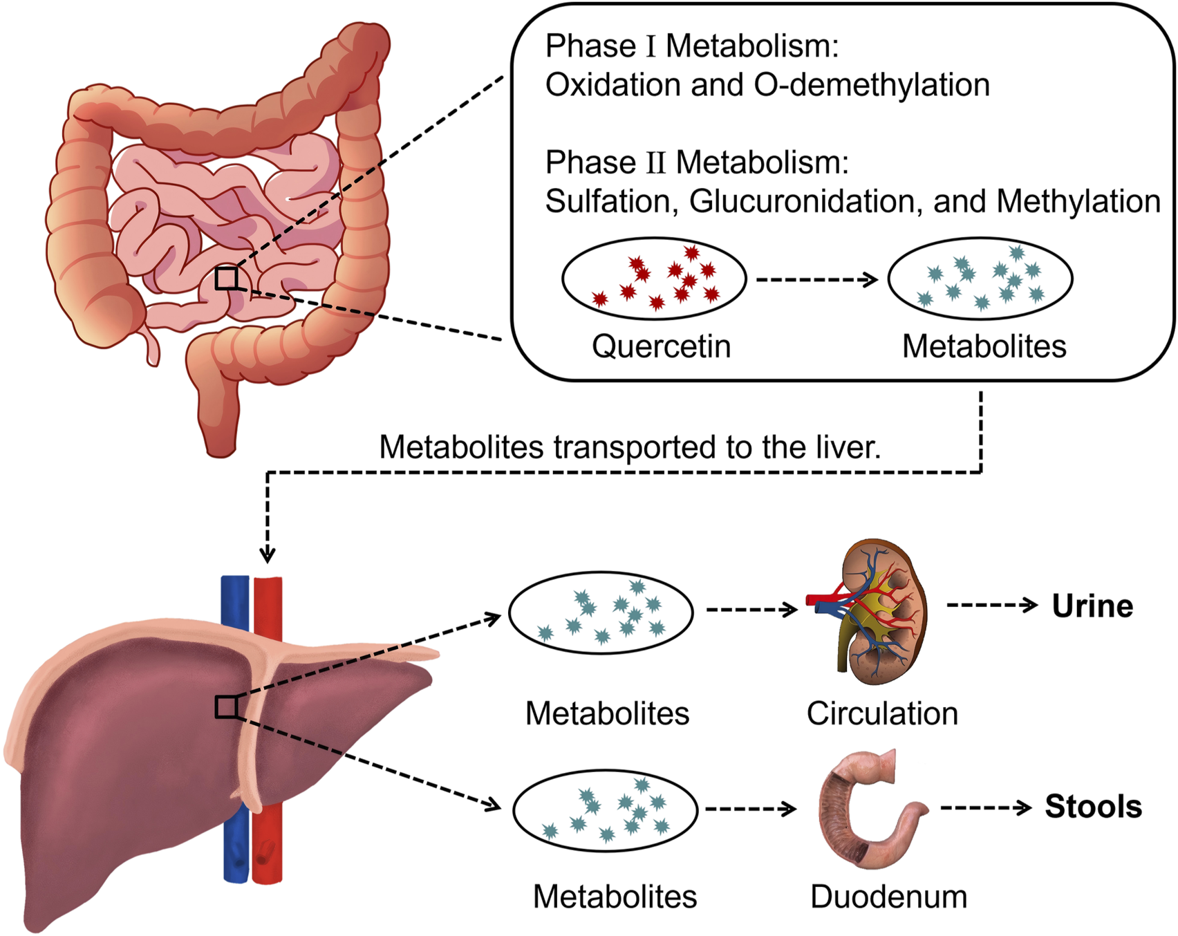 Pomegranate peel also contains flavonoids such as quercetin, catechin, and kaempferol. Among them, quercetin is one of the most common flavonoids, though its content in pomegranate peel is relatively low (Kumar et al., 2022). After oral administration, quercetin is metabolized into derivatives such as O-glycosides and C-glycosides. These metabolites are absorbed in the small intestine, bind to serum albumin, and are transported to the liver, where they undergo sulfation, glucuronidation, and methylation to form stable metabolites, which are then distributed throughout the body (Figure 3) (Manach et al., 1995; Nijveldt et al., 2001; Zhang et al., 2023). Quercetin exerts antioxidant effects by directly scavenging reactive oxygen species (ROS) and chelating metal ions (Min et al., 2019; Tang et al., 2014). It also improves cardiovascular health by modulating the hsp70/ERK/PPAR signaling pathway (Oyagbemi et al., 2018; Pereira et al., 2018).