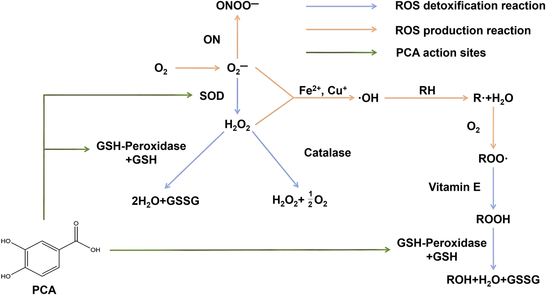 ROS are byproducts of aerobic metabolism and primarily include superoxide anion (O2−), hydrogen peroxide (H2O2), and hydroxyl radical (⋅OH). When ROS become free radicals due to unpaired electrons, if not neutralized by antioxidants in a timely manner, they can cause oxidative damage to biological macromolecules such as lipids, proteins, and DNA. This oxidative damage can lead to cellular dysfunction, aging, and the onset of various diseases (Song et al., 2020). As a natural polyphenolic metabolite, PCA exerts its antioxidant effects through multiple mechanisms. PCA enhances the activity of intracellular antioxidant enzymes, such as superoxide dismutase (SOD) and glutathione peroxidase (GSH-Px), promoting the clearance of ROS and alleviating oxidative stress in cells (Figure 4) (Cadena-Iniguez et al., 2024; Laskar and Mazumder, 2020). PCA also inhibits the Fenton reaction catalyzed by metal ions (e.g., Fe2+, Cu+), reducing the production of hydroxyl radicals and mitigating oxidative stress from the source (Shahidi and Ambigaipalan, 2015). Additionally, compared to the standard antioxidant Trolox, PCA has demonstrated stronger in vitro antioxidant activity in both lipid and aqueous environments (Kakkar and Bais, 2014). Therefore, with its multiple antioxidant mechanisms, PCA serves as an effective natural antioxidant, aiding in the prevention of aging and various diseases related to oxidative stress.