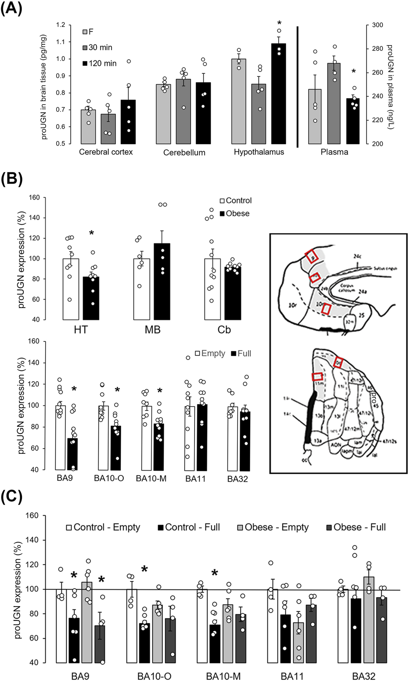 proUGN at protein levels was expressed in mouse and human brain and regulated by feeding. (A) After a meal, prouroguanylin (proUGN) expression was decreased in the hypothalamus (Ht), whereas at the same time point, proUGN concentration in plasma was increased (n = 3–5). (B) In the human Ht, expression of proUGN was decreased in individuals with obesity compared to those with normal body weight. There was no difference observed in the substantia nigra (midbrain–MD) or in the cerebellar cortex (Cb, n = 6–11). In addition, proUGN expression decreased in human Brodmann areas (BA) 9 and 10 (-O: orbital, -M: medial), but not in BA11 and BA32, in individuals with more than 200 mL (“full”) of stomach content (n = 8–10). (C) In individuals with obesity, the difference in proUGN expression due to fullness of the stomach was not present in BA10 (n = 4–6). Results are presented as mean ± SEM. *p < 0.05 indicated a statistically significant difference [(A, C) one-way ANOVA with Tukey’s post hoc test; (B) unpaired, two-tailed Student’s test].