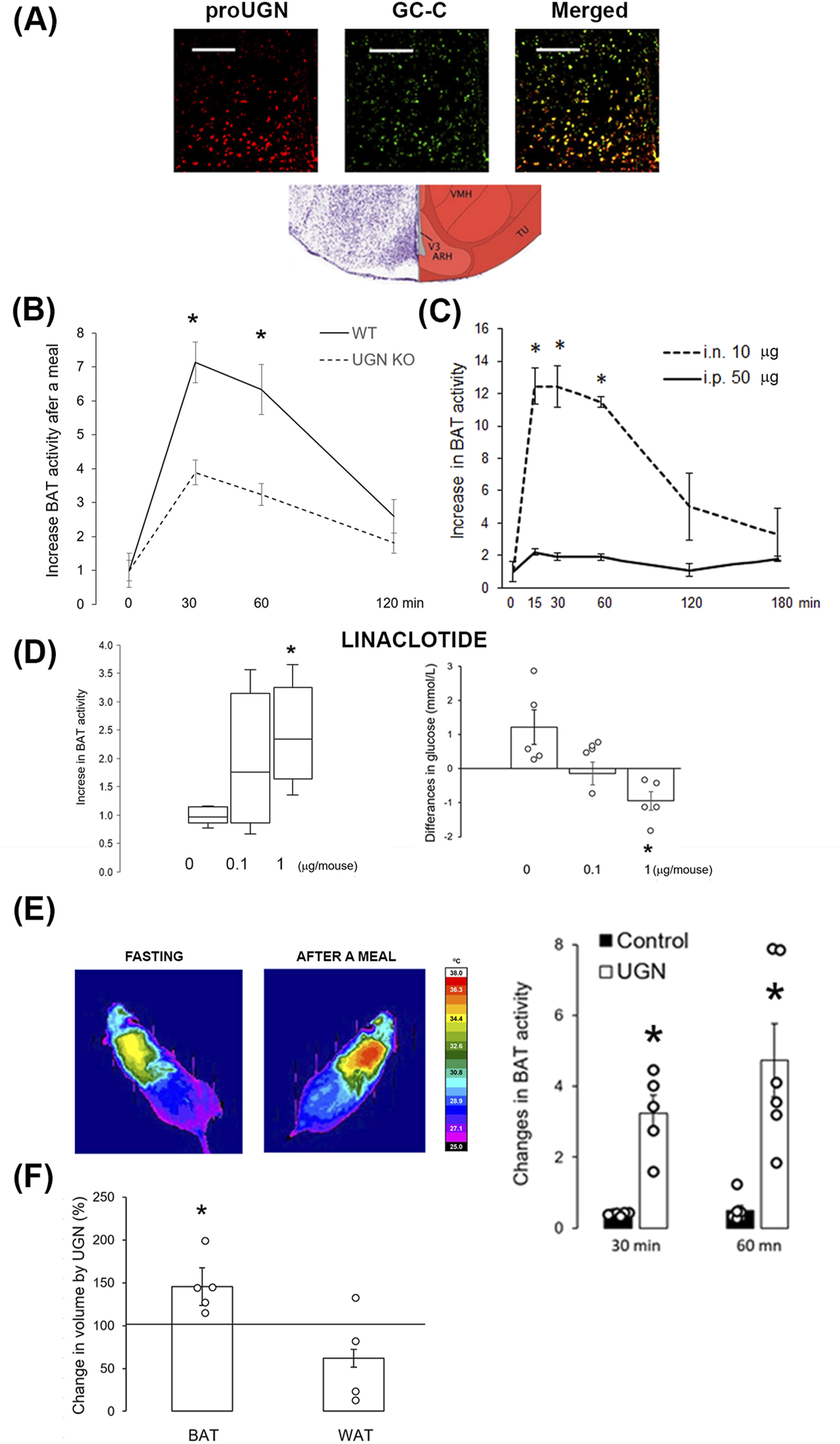 Given the well-documented physiological role of GC-C in the arcuate nucleus of the hypothalamus in the regulation of feeding and BAT activity, we demonstrated the presence of proUGN (a precursor of UGN) near UGN’s receptor, GC-C (Figure 4A). To confirm previously reported effects of UGN on acute BAT activation after a meal, we conducted experiments on male WT and UGN KO mice (littermates). At 30 min and 1 h after a meal, WT mice exhibited a greater increase in BAT activity than UGN KO mice (Figure 4B). To investigate whether plasmatic UGN can affect hypothalamic UGN receptor, we applied a dose of UGN i.n. that was five times lower than the i.p. dose. I.n. application resulted in a more than 6-fold increase in BAT activity compared to i.p., lasting up to 1 hour after application (Figure 4C). The activation of GC-C in the brain was confirmed by a dose-dependent increase in BAT activity 1 hour after i.n. linaclotide (a GC-C agonist) application, which, at a dose of 1 µg/mouse, significantly decreased the plasma glucose concentration (Figure 4D).