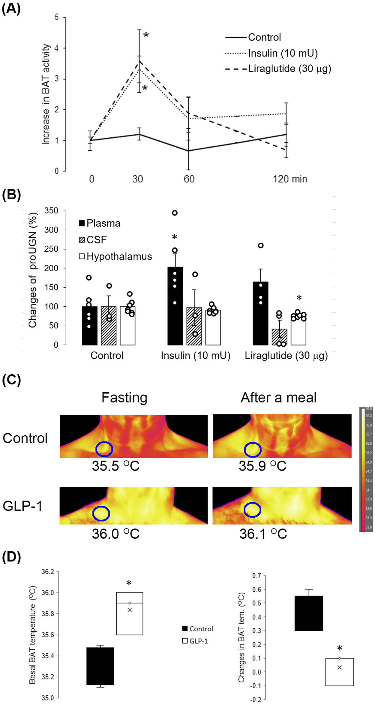 Effects of insulin and liraglutide on proUGN expression and BAT activity. (A) Thirty minutes after insulin and liraglutide intranasal (i.n.) application, BAT activity increased (n = 7). (B) Insulin increased proUGN plasma concentration but did not affect its levels in the cerebrospinal fluid (CSF) or hypothalamus. Liraglutide decreased proUGN expression in the hypothalamus but did not significantly alter its concentrations in the CSF and plasma. Results are presented as mean ± SEM (n = 3–7). (C) BAT activity after a meal in patients with type 2 diabetes (T2D), with or without GLP-1 therapy, is demonstrated in the original scans. (D) Basal temperature was higher, and the postprandial increase in BAT activity was lower in patients with T2D undergoing GLP-1 therapy than in patients with T2D receiving other types of therapy (control group, results are presented as median and interquartile range). *p < 0.05 indicated a statistically significant difference; (A, B) one-way ANOVA with Tukey’s post hoc test; (D) unpaired, two-tailed Student’s test (n = 4).