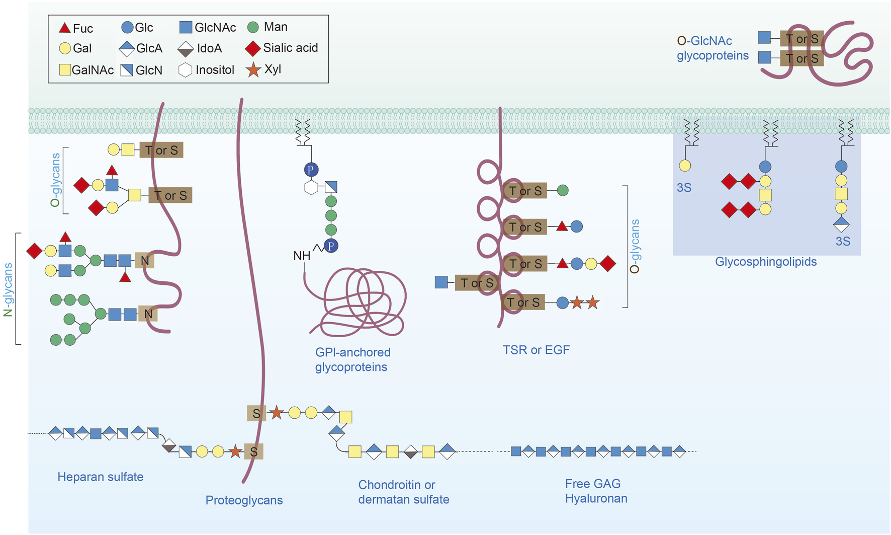 Figure 1. Major types of glycosylation in humans. Protein glycosylation comprises O-linked glycans, N-linked glycans, glycosaminoglycans, phosphorylated glycans and glycosylphosphatidylinositol (GPI) attached to peptide backbones and C-mannosylation to the tryptophan residues.