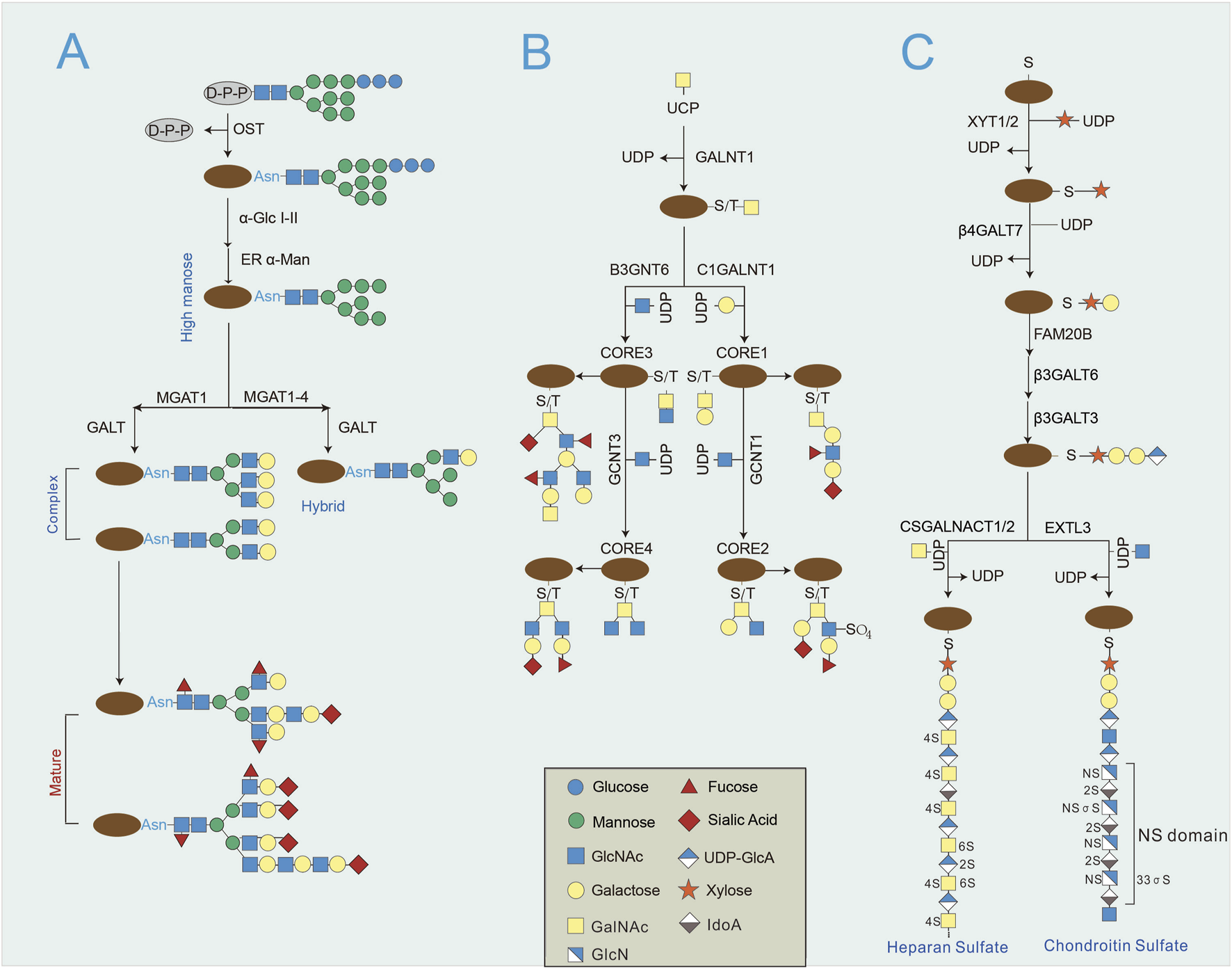 Figure 2. The primary synthesis of N-glycosylation and O-glycosylation. (A) N-glycosylation initiates with a preassembled 14 sugar glycan forms dolichol to Asn residues by the Asn-X-Ser/Thr sequence. Subsequently, glycans are further processed by glucosidases, mannosidases and glycosyltransferases, producing hybrid and complicated N-glycans. (B) O-glycosylation begins by adding sugar molecule to Ser or Thr residues, followed by various core structure extensions and elongations. (C) Proteoglycans belong to a unique group of O-glycosylated types of proteins, which starts by adding xylose to Ser residues by XYLT1/2. Proteoglycans contain glycosaminoglycans in the protein core, which is composed of a common tetrasaccharide linker, Xyl-Gal-Gal-GlcA, forming linear polysaccharides. Afterwards, repeating disaccharide units are sequentially incorporated, such as GlcNAc, GalNAc, GlcA and iduronic acid.