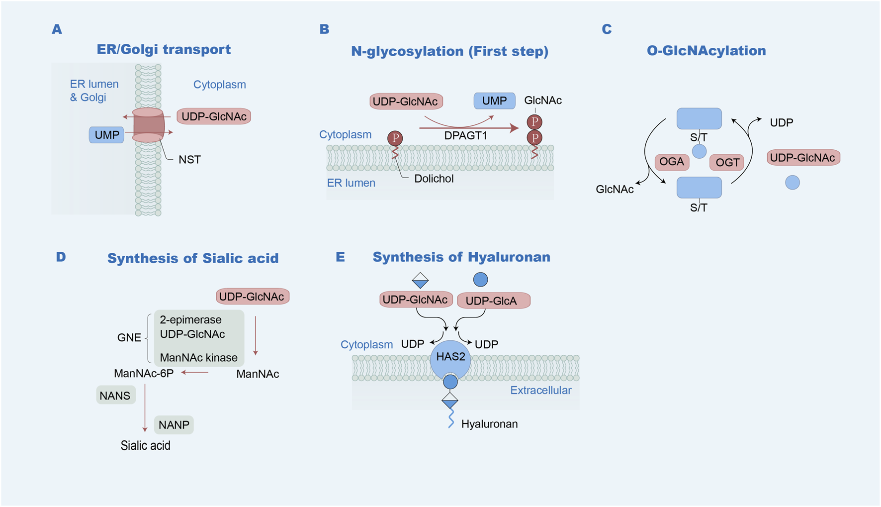 Figure 3. UDP-GlcNAc metabolism pathways. (A) Delivery to the Golgi apparatus or ER: UDP-GlcNAc is transported into the Golgi or ER by NSTs, accompanied with the export of UMP. UDP-GlcNAc is available for the production of the N-glycosylation and O-glycosylation of proteins. (B) GlcNAc-1-P from UDP-GlcNAc is transferred to Dol-P, forming Dol-P-P-GlcNAc in the initial process of N-glycan synthesis on the ER via DPAGT1. (C) UDP-GlcNAc is used as the substrate for the attachment of O-GlcNAc by OGT. (D) Sialic acid generation: UDP-GlcNAc is catalyzed by the UDP-N-acetylglucosamine 2-epimerase/N-acetylmannosamine kinase (GNE), followed by N-acetylneuraminic acid synthase (NANS) and N-acylneuraminate-9-phosphatase (NANP) to form sialic acid. (E) Hyaluronan synthesis: UDP-GlcNAc and UDP-GlcA are catalyzed by hyaluronan synthases, such as HAS2, with the concomitant release of UDP.