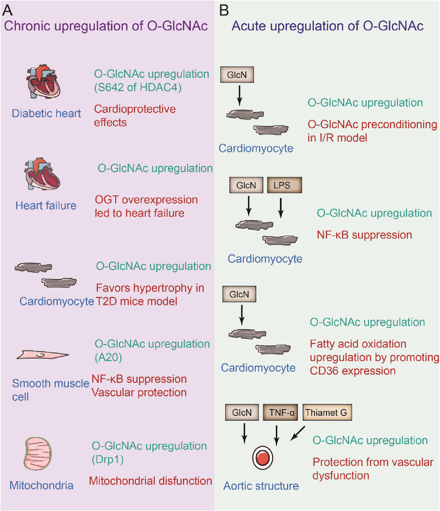 Figure 4. Beneficial and defective effects of O-GlcNAcylation by chronic or acute upregulation of specific modification. (A) Under chronic elevated O-GlcNAcylation on diabetic hearts, heart failure, cardiomyocyte, smooth muscle cell. (B) Acute elevation of O-GlcNAcylation on cardiomyocyte and aortic segments under certain circumstance.