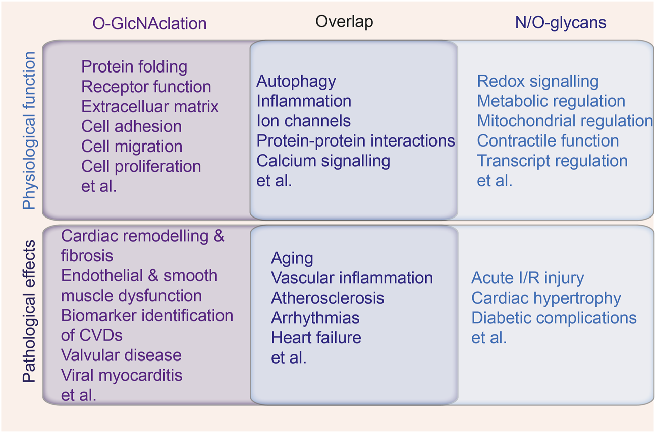 Figure 5. The intersection of N-glycans, O-glycans and O-GlcNAcylation in cardiac physiology and pathology. The physiological function and pathological effects of N-glycans, O-glycans and O-GlcNAcylation in cardiovascular system, with the middle overlap indicating the biological processes and diseases mediated by all the types of protein glycosylation.