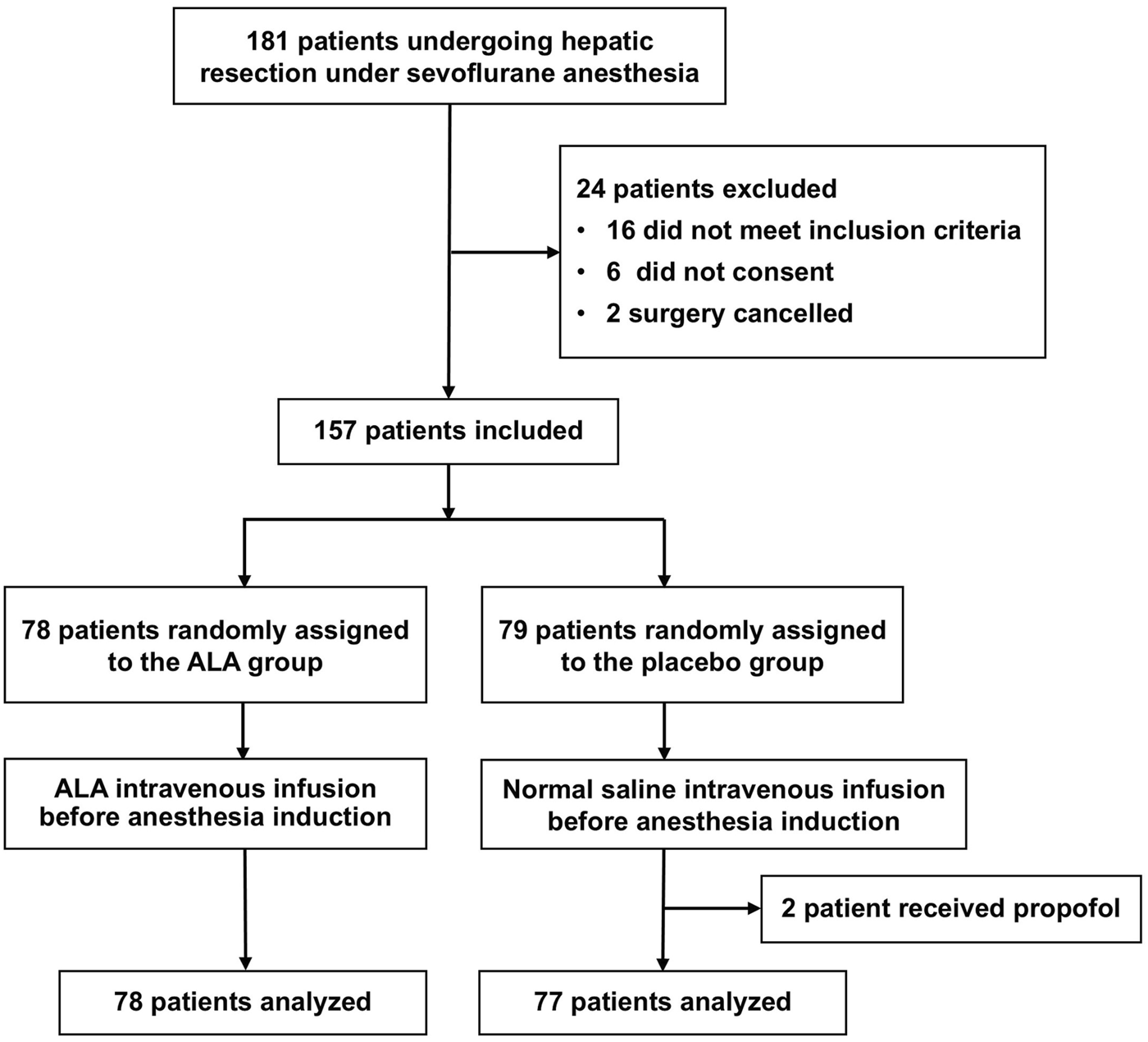 Figure 1. Flow diagram. A total of 157 patients were randomized, with 78 assigned to the ALA group and 79 to the placebo group. Two patients in the placebo group were excluded due to protocol deviations (intraoperative propofol use), resulting in 155 patients included in the final analysis.