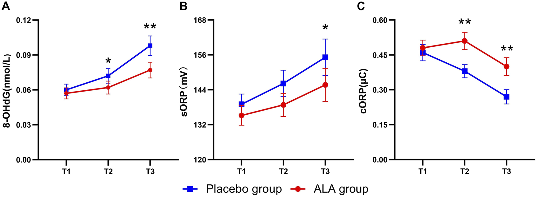 Figure 2. Dynamics of oxidative stress biomarker levels in the Placebo and ALA groups. Changes in 8-OHdG (A), sORP (B), and cORP (C) levels across T1 (before anesthesia induction), T2 (2 h after induction), and T3 (24 h after surgery) time points. Error bars indicate the standard error of the mean (SEM). Statistical significance is denoted as follows: *P < 0.05, **P < 0.01.