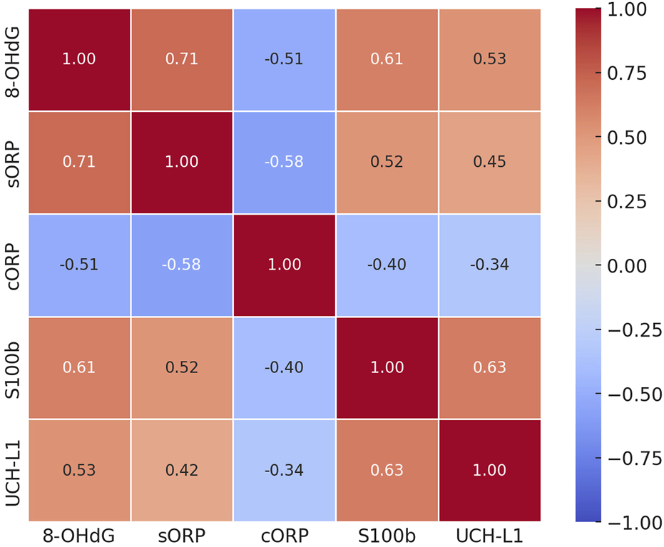 Figure 4. Correlation matrix of oxidative stress and brain damage markers 24 h after surgery. This heatmap shows Pearson correlation coefficients between oxidative stress markers (8-OHdG, sORP, and cORP) and brain damage markers (S100β and UCH-L1) at the T3 time point. Red indicates positive correlations, and blue indicates negative correlations. The values within each cell represent the correlation strength.