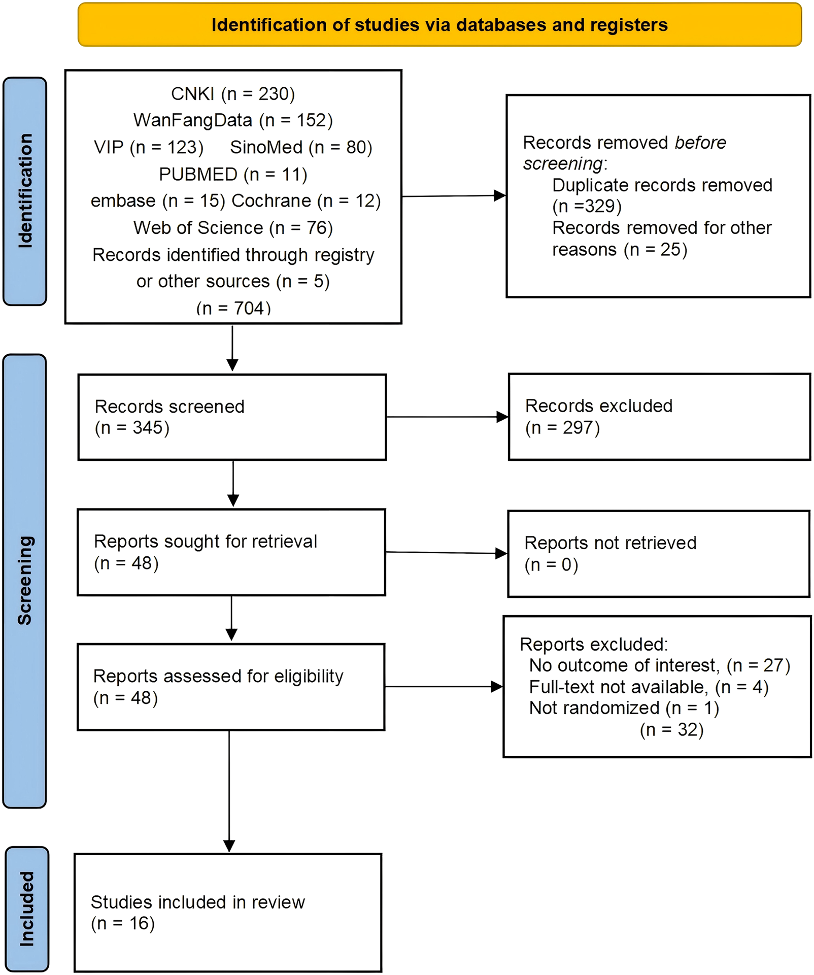 The process of selecting the included studies and the specific reasons for excluding articles is illustrated in the PRISMA flowchart (Figure 1). From the eight databases mentioned above, 699 articles were retrieved. Additionally, supplementary searches of clinical trial registries (ClinicalTrials.gov, WHO-ICTRP) and reference lists identified five additional eligible studies, resulting in 704 unique records for screening. After removing duplicates, 345 articles remained for further evaluation. After screening the titles and abstracts, we excluded 297 papers that did not meet the inclusion criteria. The remaining 48 articles were assessed through full-text review. Among these, 32 studies were excluded due to various reasons. Ultimately, 16 studies were included in the meta-analysis.