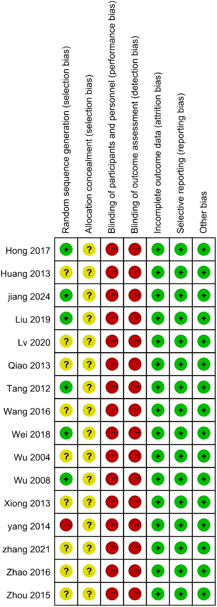 Six RCTs demonstrated a low risk of bias in “random sequence generation” (Wu et al., 2008; Tang et al., 2012; Hong et al., 2017; Wei et al., 2018; Liu, 2019; Jiang et al., 2024), while one study exhibited a high risk (Yang et al., 2014), and the remaining studies presented an unclear risk of bias. Notably, none of the studies mentioned the methods of “allocation concealment”, resulting in an unclear appraisal for these domains. Since all the studies employed a non-blind design, the “Blinding of participants and personnel” and “Blinding of outcome assessment” items were consistently rated as high risk across all studies. All studies showed a low risk of bias regarding “incomplete outcome data”, “selective reporting” and “Other bias”. The systematic assessment of bias is illustrated in Figures 2, 3. Moreover, this study was assessed using the AMSTAR 2 and PRISMA 2020 checklists, with the results presented in Supplementary Table 4. Funnel plots corresponding to the results of the four clinical outcomes are shown in Supplementary Figure 1.