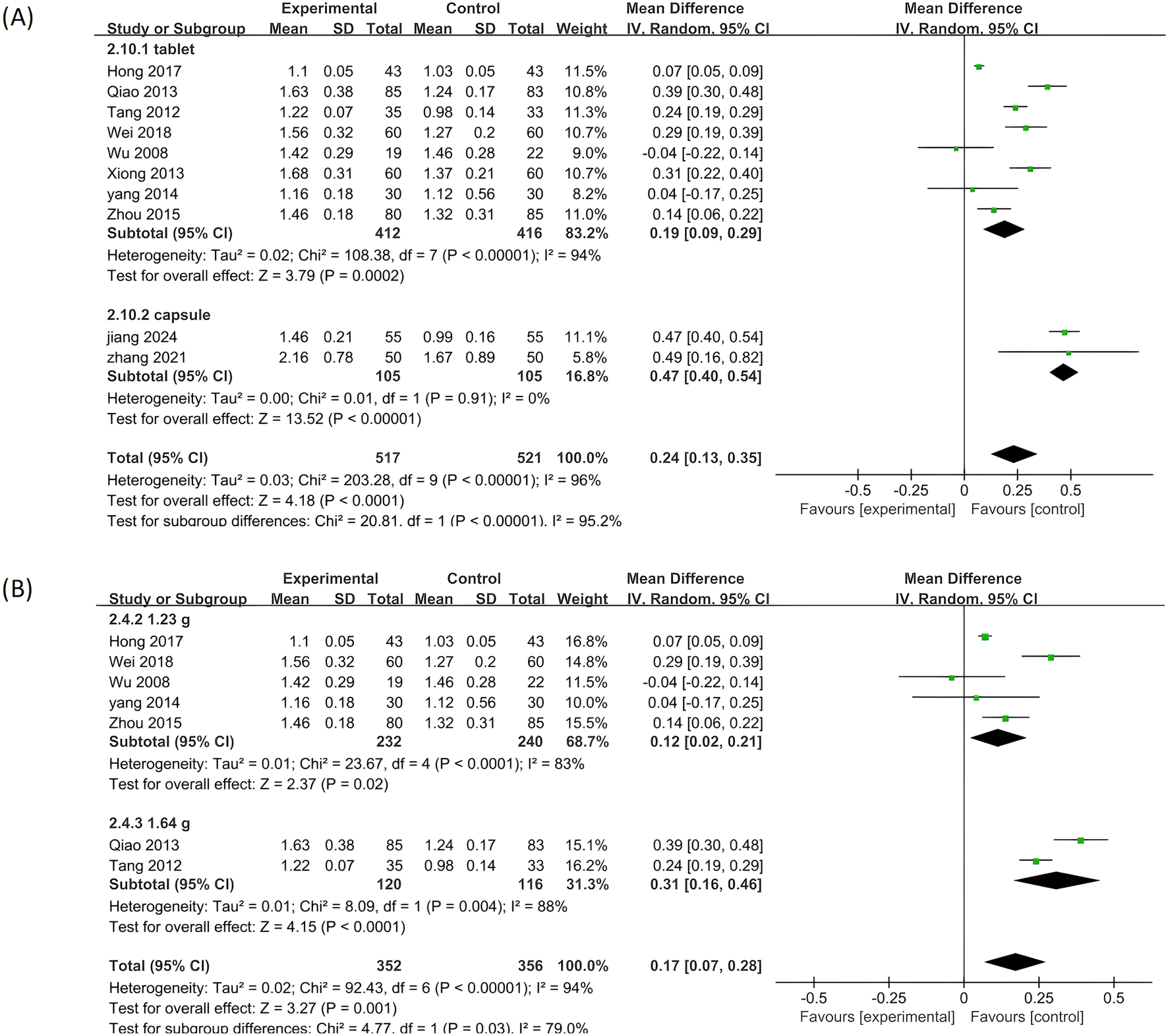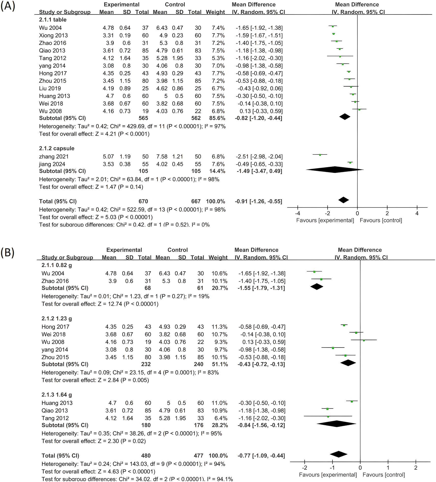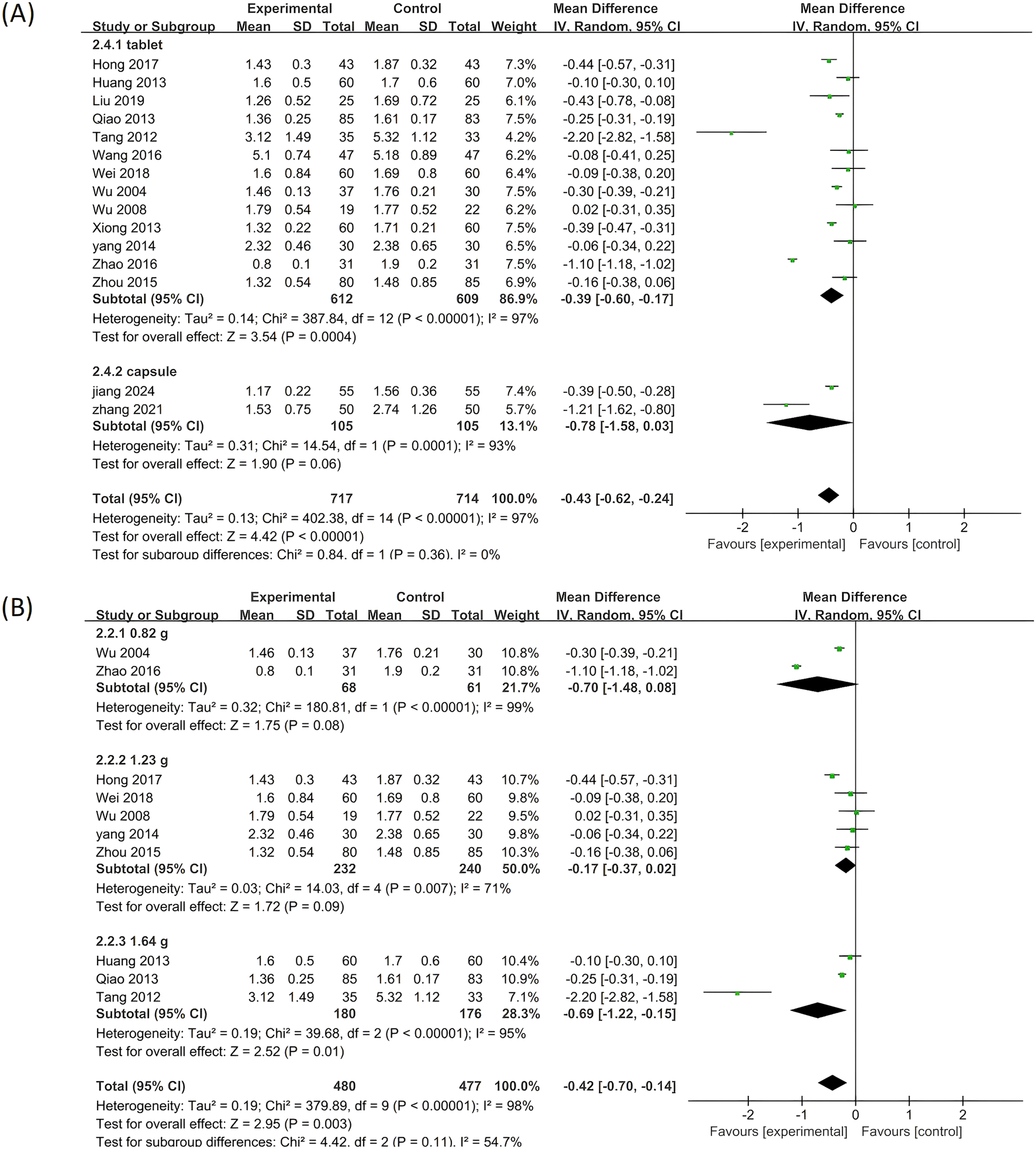 Figure 7. Subgroup analysis of the TG. (A) Stratified by the form of a drug. (B) Stratified by drug dose.
