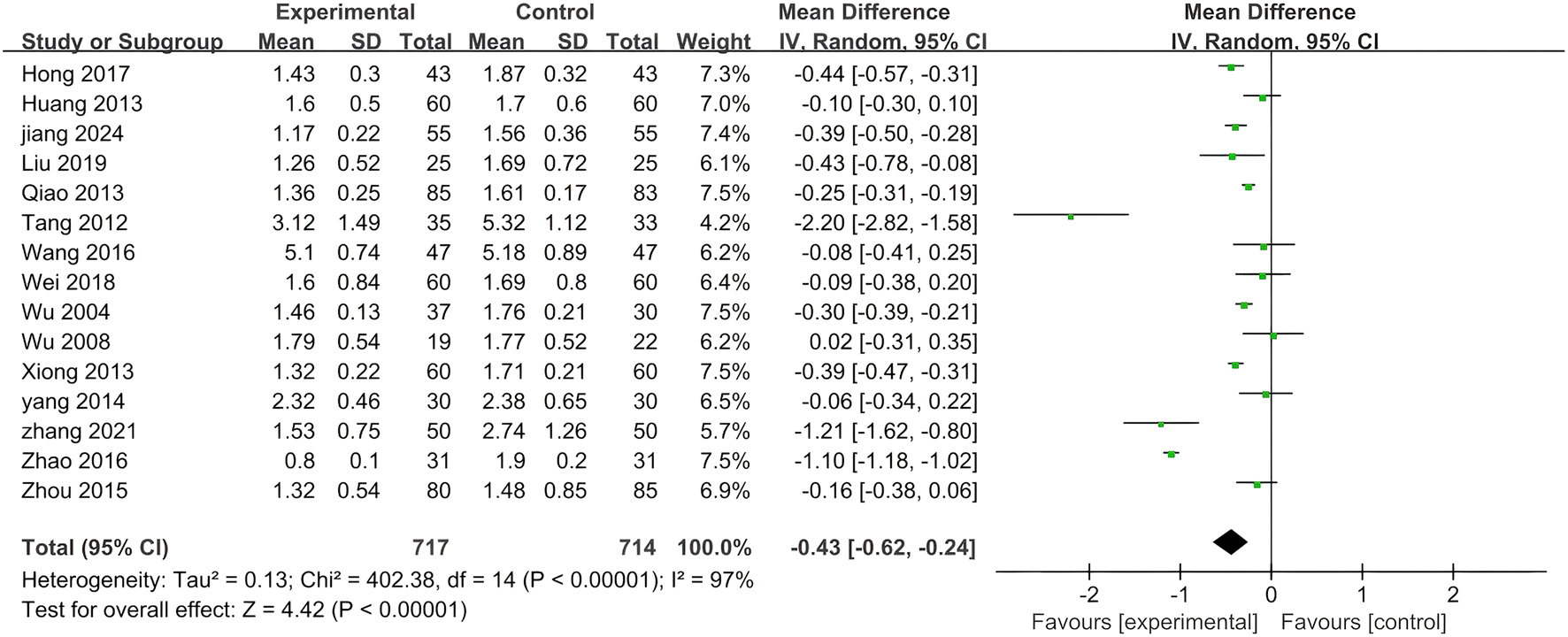 TG was utilized as a detection index in 15 studies. As depicted in Figure 6, a random effects model was adopted for the analysis due to the significant heterogeneity observed among the 15 studies (p < 0.00001, I2 = 97%). The findings indicated that the combined application of PLE, in conjunction with the standardized treatment, could more effectively diminish the level of TG (MD = −0.43; 95% CI: −0.62 to −0.24; Z = 4.42, p < 0.00001).
