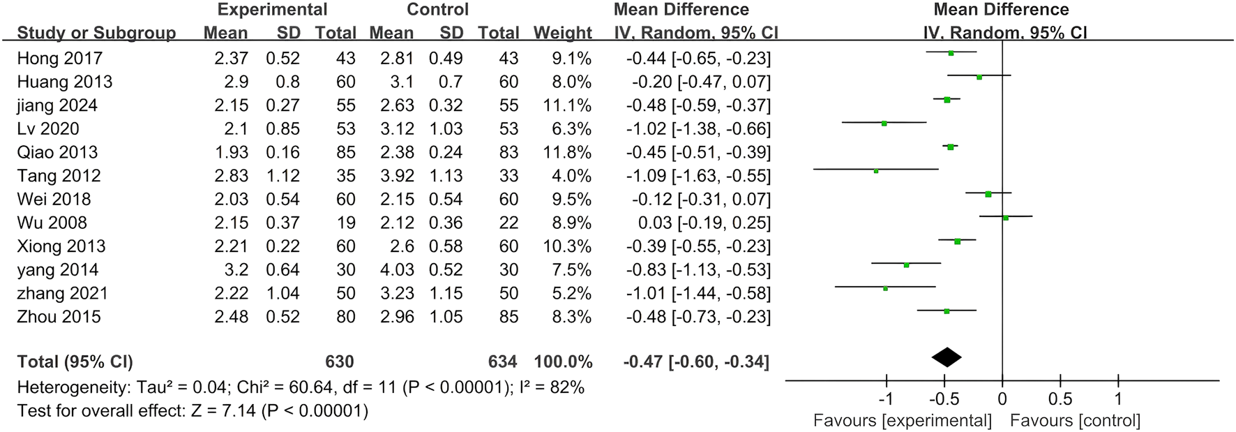 Twelve of the included clinical studies reported LDL-C as an outcome measure. As depicted in Figure 8, significant heterogeneity was observed among the twelve studies (p < 0.00001, I2 = 82%), prompting the adoption of the random effects model in this analysis. Compared to standardized treatment, adding PLE as combination therapy significantly reduced the LDL-C levels (MD = −0.47; 95% CI: −0.60 to −0.34; Z = 7.14, p < 0.00001).