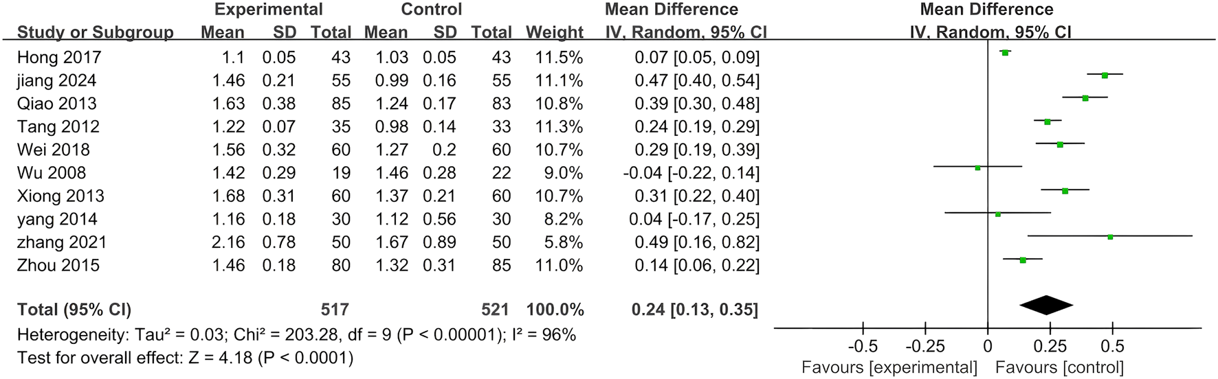 Figure 4. A forest plot comparing PLE combination therapy with standardized treatment for TC. The experimental group comprised patients receiving PLE in addition to standardized treatment, whereas the control group consisted solely of patients undergoing standardized treatment.