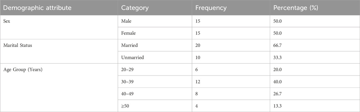 There were 30 participants in this study. Half of the participants as seen in Table 1 were males (n = 15), and the majority were aged 20–39 years (n = 18). The mean age of participants was 37.9 years. The average interview length was 25 min.
