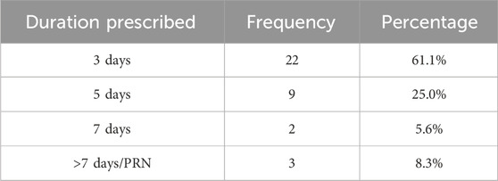 As seen in Table 2, most patients were prescribed the combination of codeine and paracetamol, followed by tramadol 50 mg and codeine 15 mg. The majority of prescriptions included “when needed” instructions. The longest duration of opioid use was for morphine 10 mg, prescribed at night for 1 month, while the shortest duration was 3 days for several other medications see Table 3.