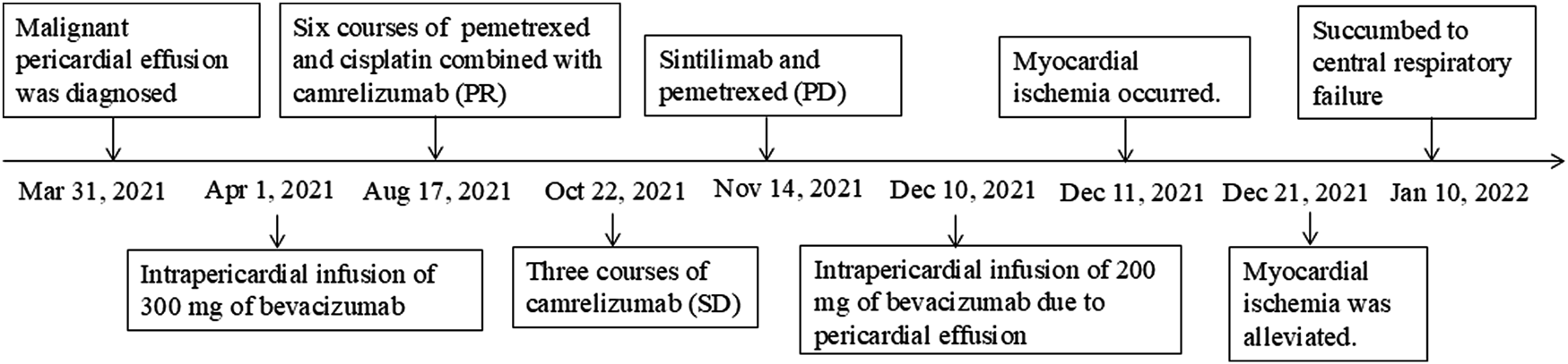 A 48-year-old female was admitted to a local hospital because of tussiculation and chest tightness on 23 March 2013. Chest computed tomography revealed a right hilar mass (Figure 1A), pleural effusion (Figure 1B), and pericardial effusion (Figure 1B). Right thoracic puncture and drainage were performed, and pleural effusion examination found adenocarcinoma cells. Needle aspiration cytology of the right supraclavicular lymph node indicated adenocarcinoma. The patient came to our center for further treatment on 31 March 2021. Cervical lymph node biopsy indicated metastatic adenocarcinoma which came from lung. Pericardiocentesis and drainage were performed, and pericardial effusion examination found adenocarcinoma cells. The patient was diagnosed with right lung adenocarcinoma with pleural and pericardial metastases (cT1N3M1a). Next-generation sequencing showed no driver gene mutations. On 1 April 2021, the patient received the first intrapericardial infusion of bevacizumab (300 mg). From April 8 to 17 August 2021, she completed six cycles of first-line therapy with pemetrexed and cisplatin combined with camrelizumab. This was followed by three cycles of camrelizumab maintenance therapy from September 9 to 22 October 2021. Due to disease progression, treatment was switched to sintilimab plus pemetrexed on 14 November 2021. Throughout this period, electrocardiograms and myocardial enzyme levels remained within normal limits, and the pericardial effusion was well-controlled, with only a minimal amount remaining. On 10 December 2021, the patients received the second intrapericardial infusion of 200 mg of bevacizumab due to worsening pericardial effusion. The following day (December 11), the patient developed acute chest pain. Myocardial enzymes (Figure 2) were significantly elevated and electrocardiography (Supplementary Data Sheet S1) showed ST-T changes and QTc prolongation. The N-terminal pro-brain natriuretic peptide level was 11,507 pg/mL and echocardiogram showed a normal ejection fraction. Bevacizumab-associated cardiotoxicity (myocardial ischemia) was initially suspected. Methylprednisolone, aspirin, and heparin were administered for treatment. The myocardial enzyme levels trended downward within 2 days, and the chest pain resolved after 10 days. Unfortunately, the patient died of central respiratory failure on 10 January 2022. Figure 3 presented the patient’s treatment timeline.