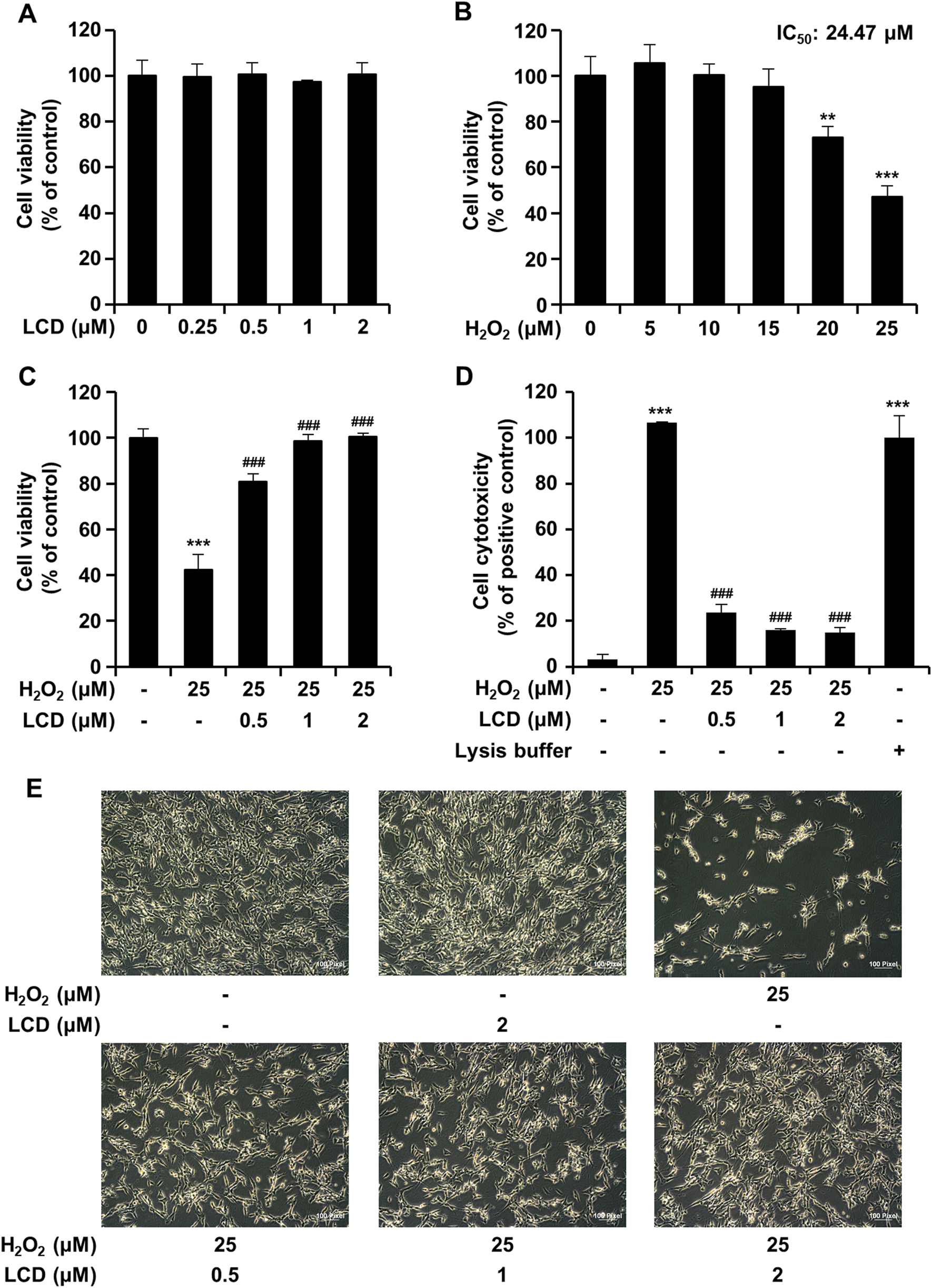 Inhibitive effects of LCD on H2O2-induced cell death. Cells were pretreated with LCD (at 0.5, 1, or 2 μM) for 3 h, and then cultured with H2O2 (25 μM) for 24 h. (A–C) Viability of SH-SY5Y cells was determined by CCK-8 assay. Results are presented as the mean ± SEM of three independent experiments (n = 5). (D) LDH activity was assayed using a CytoTox 96 Non-Radioactive Cytotoxicity Assay kit. (E) Microscopy showing the effects of LCD on H2O2-induced cytotoxicity in SH-SY5Y cells. Scale bar, 100 μm. Results are presented as the mean ± SEM of three independent experiments (n = 3). **p < 0.01, ***p < 0.001 vs. control group, ###p < 0.001 vs. H2O2 treatment group.