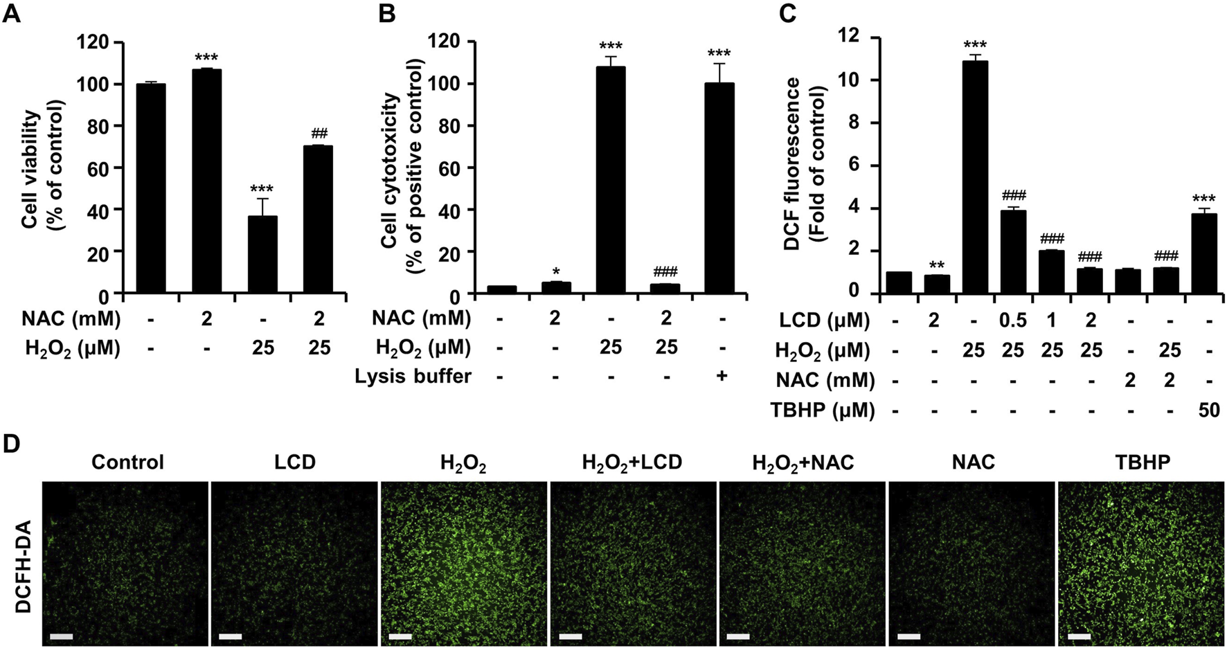 Effects of NAC and LCD pretreatment on the H2O2-induced decline in cell viability, cytotoxicity and ROS generation. Differentiated SH-SY5Y cells were pretreated with 2 mM NAC for 3 h, followed by exposure to 25 μM H2O2 for 24 h, to assess (A) cell viability via CCK-8 assay and (B) cytotoxicity via LDH assay. (C) For ROS measurement, differentiated cells were pretreated with 2 mM NAC or 2 μM LCD for 3 h, and then treated with 25 μM H2O2 or 50 μM TBHP for 1 h. Intracellular ROS levels, quantified using the DCFH-DA assay. (D) Representative fluorescence images of DCFH-DA staining (green). Scale bar: 200 μm. Experiments were performed in triplicate (n = 3). The results are presented as mean ± SEM; *p < 0.05, **p < 0.01, and ***p < 0.001 vs. the control group; ##p < 0.01, and ###p < 0.001 vs. the H2O2-treated group.