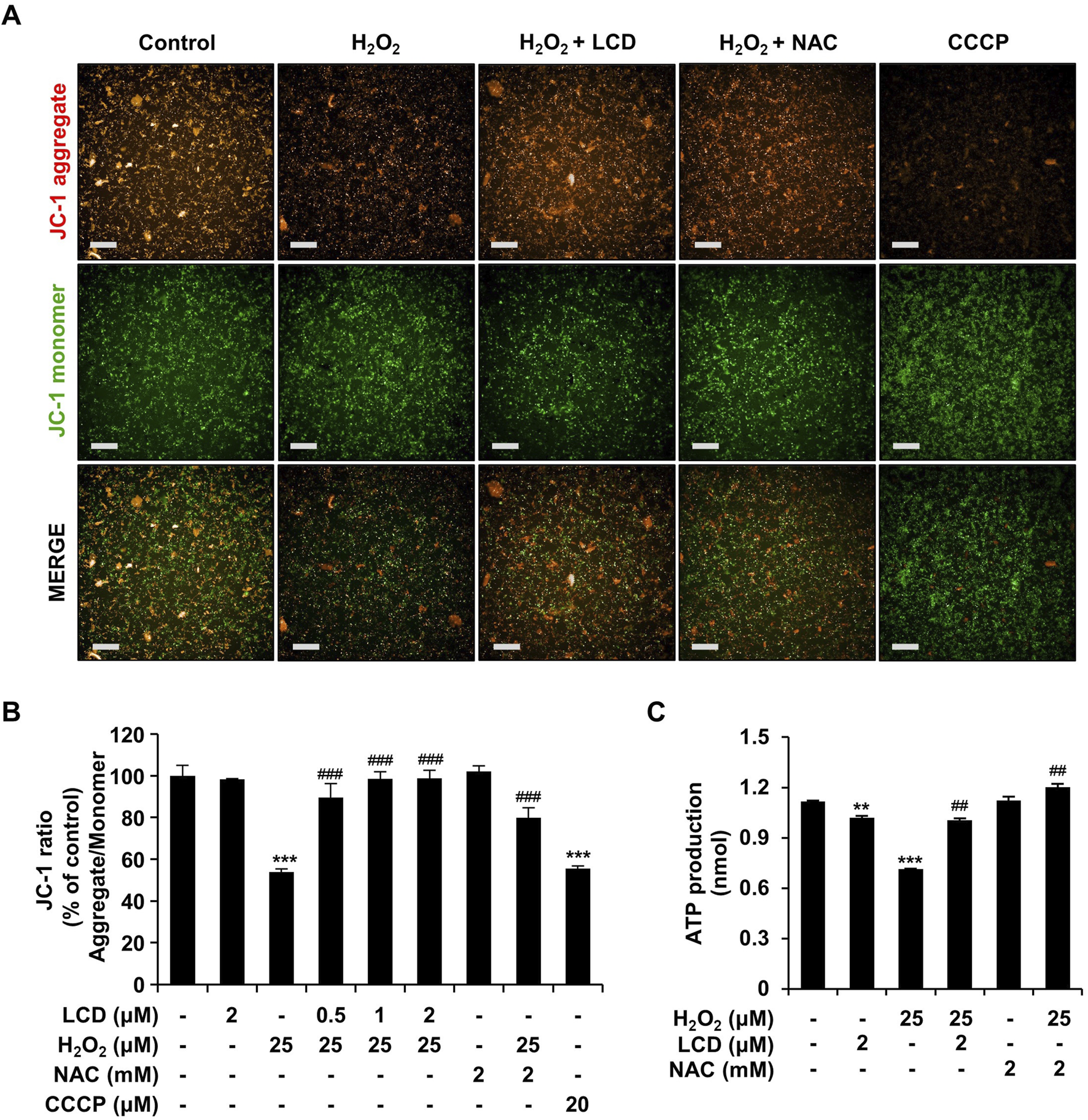 Mitigation of H2O2-induced loss of mitochondrial-membrane potential and depletion of ATP by NAC and LCD pretreatment. Differentiated SH-SY5Y cells were pretreated with 2 mM NAC or 2 μM LCD for 3 h, and then treated with 25 μM H2O2 for 24 h. Mitochondrial membrane potential was assessed using the JC-1 assay, with CCCP as a positive control. JC-1 aggregates (red) were fluoresced at 560/635 nm and the JC-1 monomer (green) at 485/535 nm. (A) Representative JC-1 fluorescence images. Scale bar: 200 μm. (B) Quantitative analysis of the red/green fluorescence intensity ratio. Experiments were performed in triplicate (n = 3). (C) Intracellular ATP levels, measured using an ATP assay kit (ab83355). The results are presented as mean ± SEM (n = 3). **p < 0.01, and ***p < 0.001 vs. the control group; ##p < 0.01 and ###p < 0.001 vs. the H2O2-treated group.