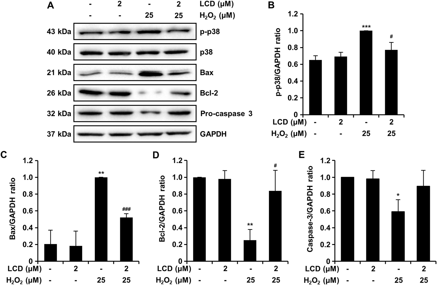 To evaluate the underlying mechanisms of action of LCD, we quantified the expression of H2O2-induced apoptosis-related proteins via Western blotting. H2O2 increased p-p38 expression, whereas LCD pretreatment reduced it (Figures 7A,B). H2O2 increased the expression of the pro-apoptotic protein Bax (Figures 7A,C) and reduced that of the anti-apoptotic protein Bcl-2 (Figures 7A,D). However, these effects were reversed under LCD and H2O2 co-treatment: Bax expression was reduced (Figures 7A,C) whereas that of Bcl-2 was increased (Figures 7A,D). H2O2 alone reduced pro-caspase 3 expression, whereas co-treatment with LCD rescued it (Figures 7A,E). These results suggest that LCD effectively inhibits H2O2-induced apoptosis.