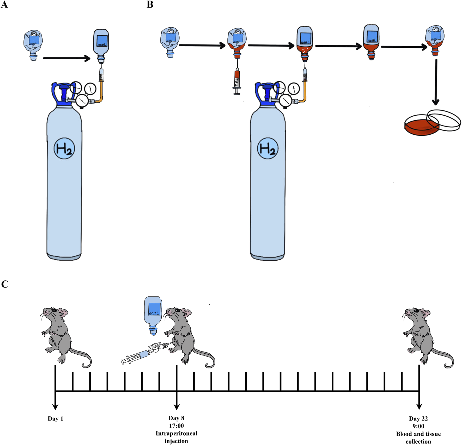 Figure 1. The methods of H2 usage and experimental process. (A) Open the pressure reducing valve with a small release pressure, exhaust the air in the plastic hose connected to the pressure reducing valve. Insert the syringe needle into the evacuated plastic infusion bottle (100 mL), then further loosen the pressure reducing valve and introduce H2 into the infusion bottle until there is no dead volume. (B) H2-rich medium was prepared by introducing H2 into the infusion bottle containing 10 mL DMEM until there is no dead volume, then, it was stored in 4°C for 6 h before used. (C) The experimental procedure is as follows: animals in H2 treatment group are intraperitoneally injected with H2 once a day at 5:00 p.m. since the eighth day. On day 22nd at 9:00 a.m., blood and liver samples are collected. In detail, there is a two-way valve connected between the injector and needle for injecting H2. Open the two-way valve, extract the required volume of H2 into the syringe, and immediately close the two-way valve. After removing the needle from the infusion bottle, immediately insert the needle into the abdominal cavity of the animals, open the two-way valve to complete the intraperitoneal injection.