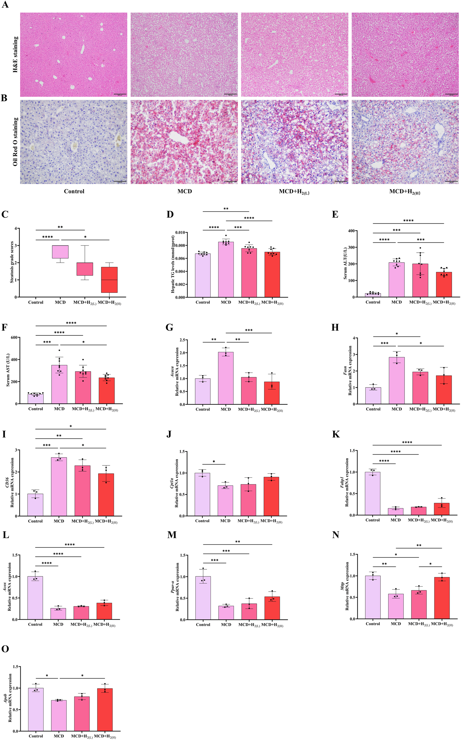 Figure 2. H2 therapy improved hepatic steatosis in mice fed with a MCD diet. (A) Liver H&E and (B) Oil Red O staining showed that both low and high doses of H2 attenuated MCD-induced hepatic steatosis. (C) Steatosis grade score, n = 8 mice in each group. (D) The levels of TG in the liver tissues, (E) Serum ALT levels, (F) Serum AST levels, n = 8 mice in each group. (G) The relative mRNA levels (ratios to Gapdh) of Acaca, (H) Fasn, (I) CD36, (J) Cpt1α, (K) Fabp1, (L) Acox, (M) Ppar-α, (N) Mttp, (O) Apob, n = 3 mice in each group. The data of steatosis grade score are expressed as median ± interquartile range, other results are expressed as means ± SD. *p < 0.05, **p < 0.01, ***p < 0.001, ****p < 0.0001.