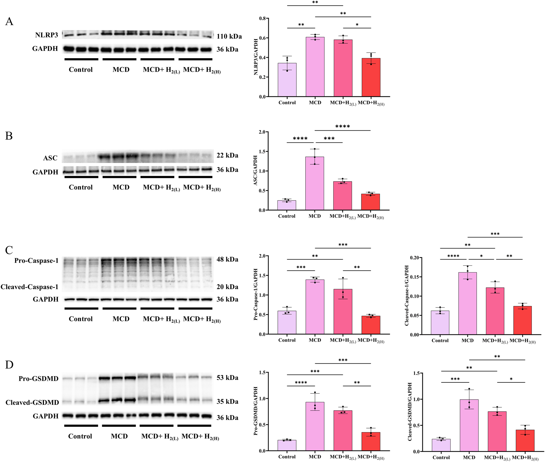 Figure 5. H2 therapy inhibited hepatic NLRP3 inflammasome activation in mice fed with a MCD diet. (A) Western blotting images of hepatic NLRP3 and GAPDH, and quantification of NLRP3/GAPDH ratio; (B) Western blotting images of hepatic ASC and GAPDH, and quantification of ASC/GAPDH ratio; (C) Western blotting images of hepatic pro-Caspase-1, cleaved-Caspase-1 and GAPDH, and quantifications of pro-Caspase-1/GAPDH and cleaved-Caspase-1/GAPDH ratios; (D) Western blotting images of pro-GSDMD, cleaved-GSDMD and GAPDH in the liver, and quantifications of pro-GSDMD/GAPDH and cleaved-GSDMD/GAPDH ratios; n = 3 mice in each group. Results are expressed as means ± SD. *p < 0.05, **p < 0.01, ***p < 0.001, ****p < 0.0001.