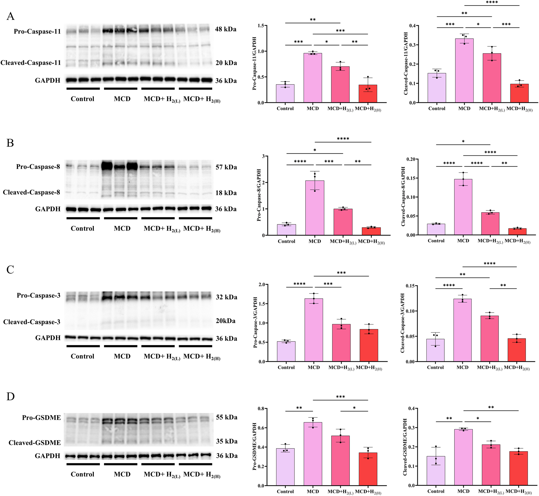Figure 6. H2 therapy inhibited the non-classical pyroptosis signaling in the liver of mice fed with a MCD diet. (A) Western blotting images of pro-Caspase-11, cleaved-Caspase-11 and GAPDH in the liver, and quantifications of pro-Caspase-11/GAPDH and cleaved-Caspase-11/GAPDH ratios; (B) Western blotting images of pro-Caspase-8, cleaved-Caspase-8 and GAPDH in the liver, and quantifications of pro-Caspase-8/GAPDH and cleaved-Caspase-8/GAPDH ratios; (C) Western blotting images of pro-Caspase-3, cleaved-Caspase-3 and GAPDH in the liver, and quantifications of pro-Caspase-3/GAPDH and cleaved-Caspase-3/GAPDH ratios; (D) Western blotting images of pro-GSDME, cleaved-GSDME and GAPDH in the liver, and quantifications of pro-GSDME/GAPDH and cleaved-GSDME/GAPDH ratios; n = 3 mice in each group. Results are expressed as means ± SD. *p < 0.05, **p < 0.01, ***p < 0.001, ****p < 0.0001.